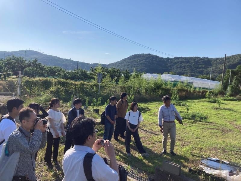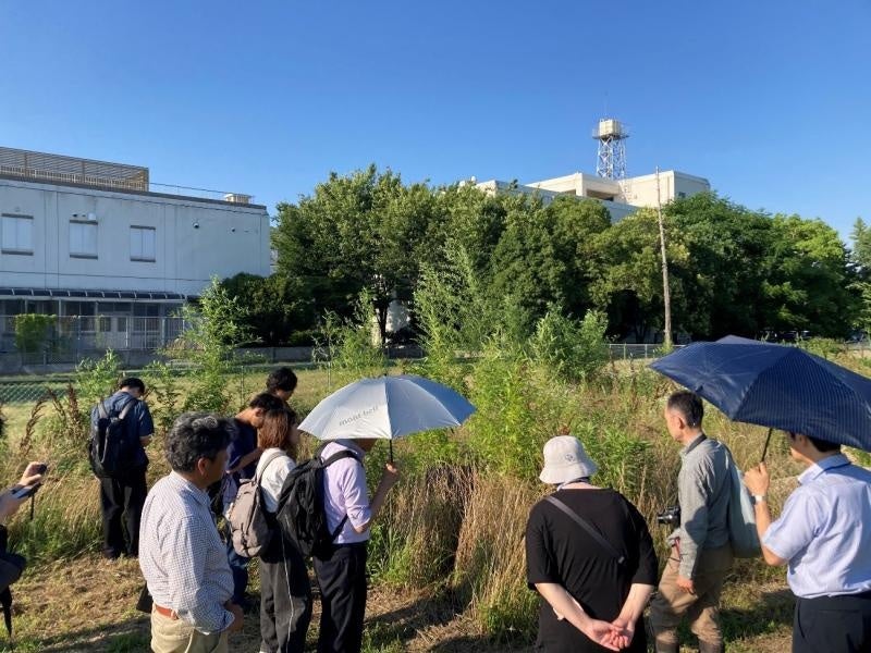 続いて、実証予定地である学内の園地を見学し、現地の植生や土壌の状況を確認しました。学術研究院先鋭研究領域(資源植物科学研究所大麦・野生植物資源研究センター)の山下純