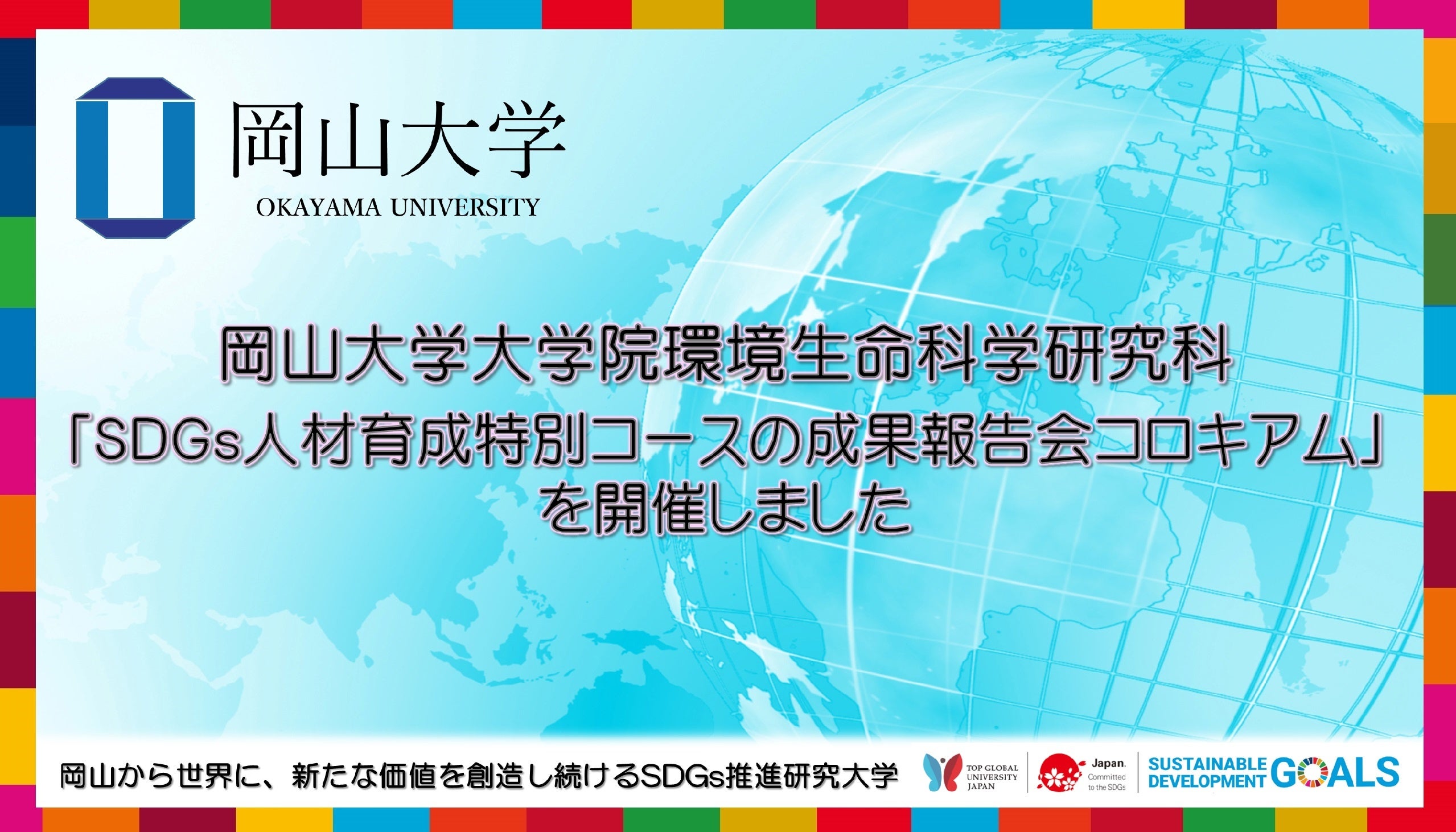 国立大学法人岡山大学(本部:岡山市北区、学長:槇野博史)の大学院環境生命科学研究科は、2022年1月25日に「Debrief Session of the Project Researches on “Environmental Rehabilitation in Asia”( SDGs人材育成特別コースの成果報告会:コロキアム)」を開催しました。