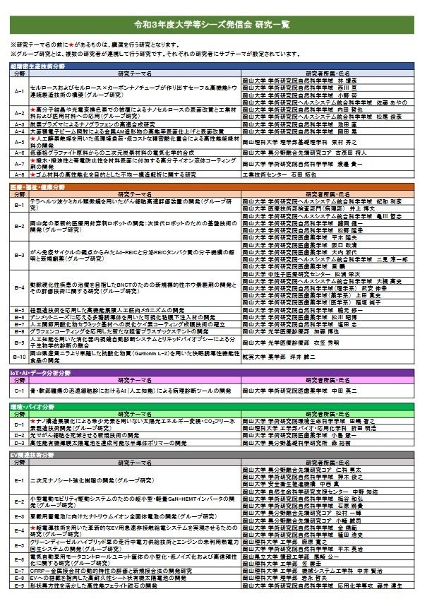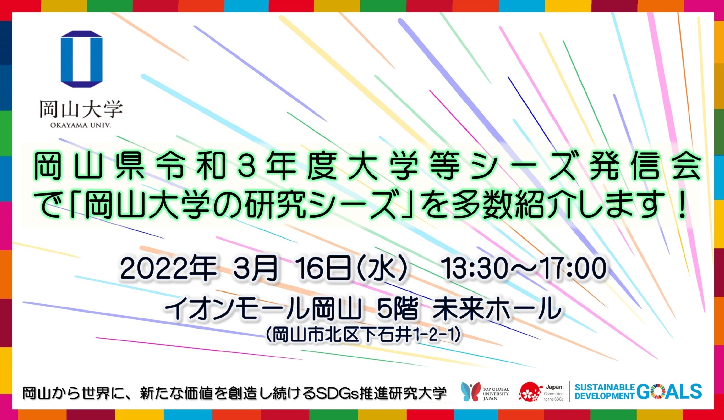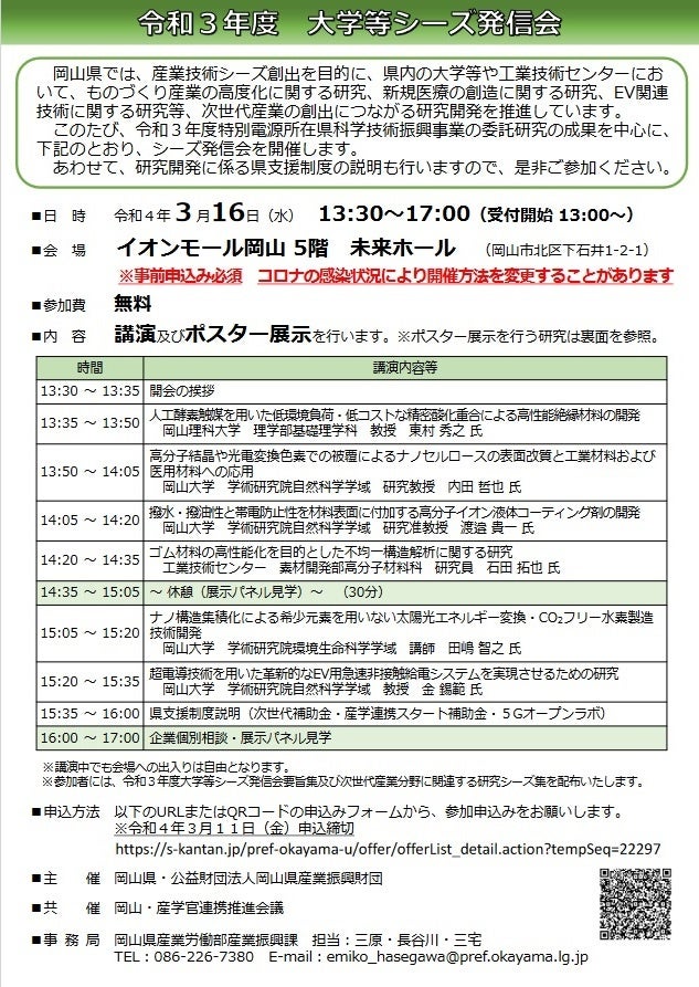 今回、岡山県主催で令和3年度特別電源所在県科学技術振興事業の委託研究の成果を中心に、2022年3月16日(水)に「シーズ発信会」をイオンモール岡山にて開催します。
