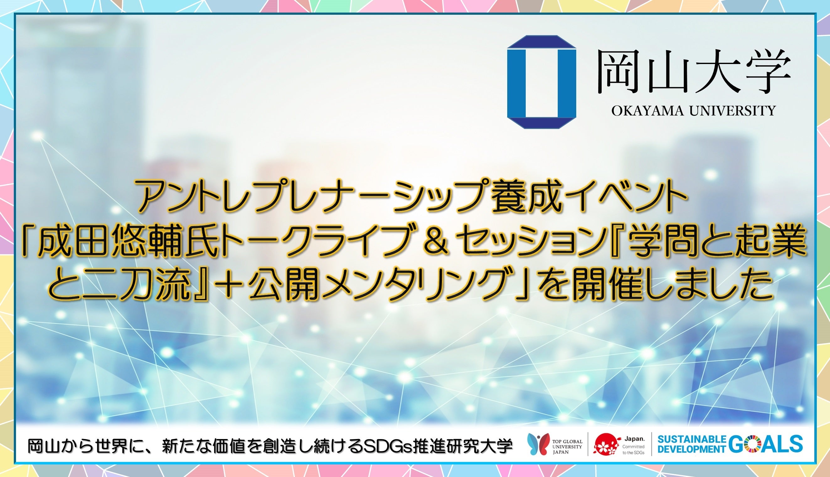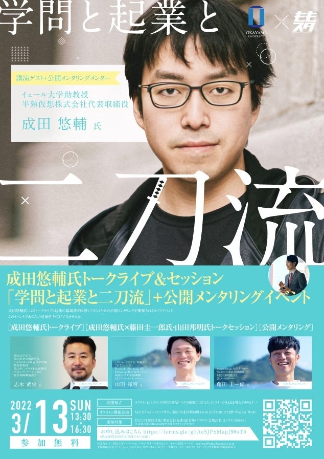 国立大学法人岡山大学(本部:岡山市北区、学長:槇野博史)は2022年3月13日、アントレプレナーシップ養成イベント「成田悠輔氏トークライブ&セッション『学問と起業と二刀流』+公開メンタリング」を岡山市の「ももたろう・スタートアップカフェ」(ももスタ)(岡山市北区)で開催しました。オンラインを併用し、約250人の学生・教職員・一般の方が会場及びオンラインで参加しました。