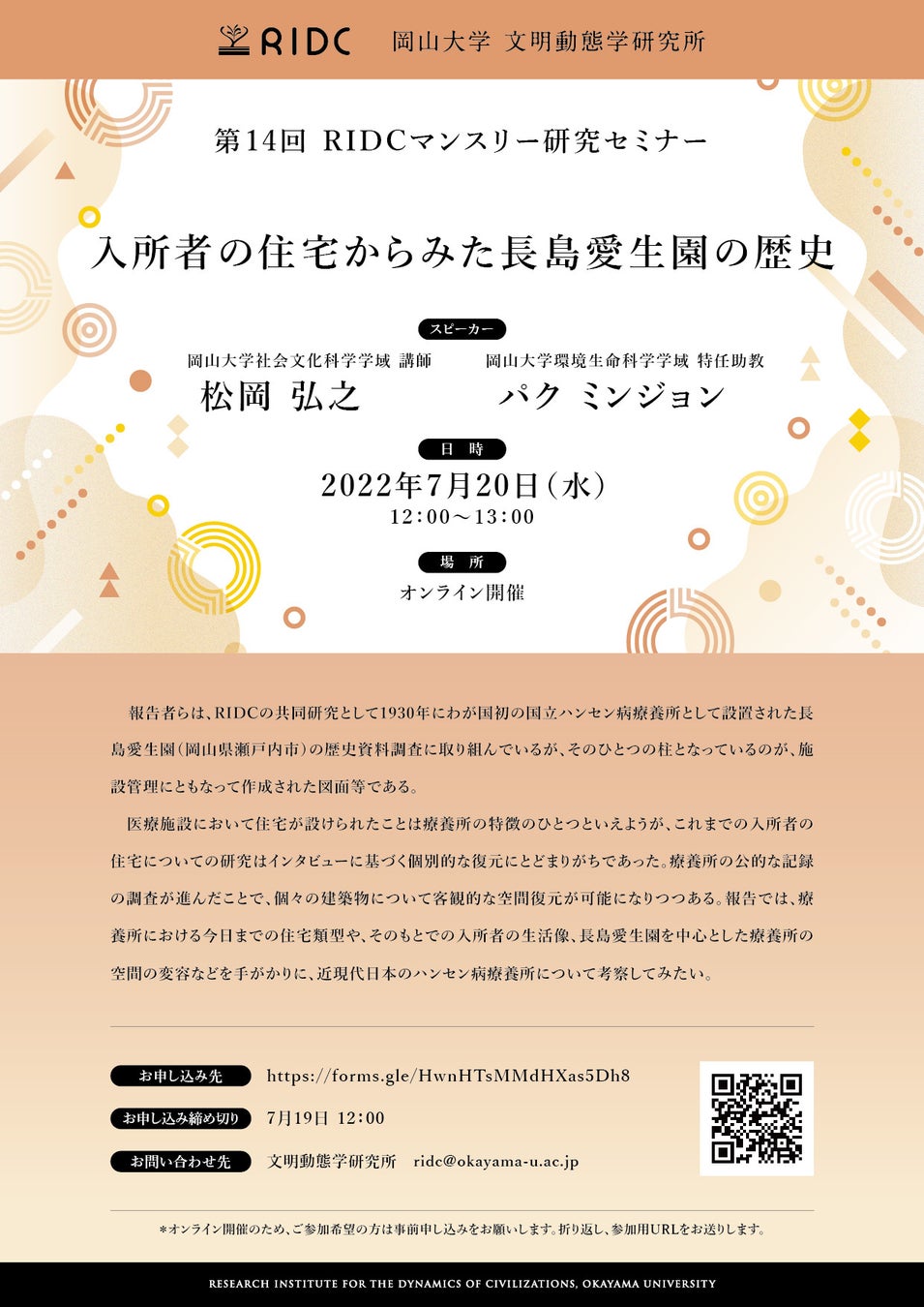 また、2022年7月20日(水)12:00~13:00には、第14回となるRIDCマンスリー研究セミナー「入所者の住宅からみた長島愛生園の歴史」(スピーカー:松岡