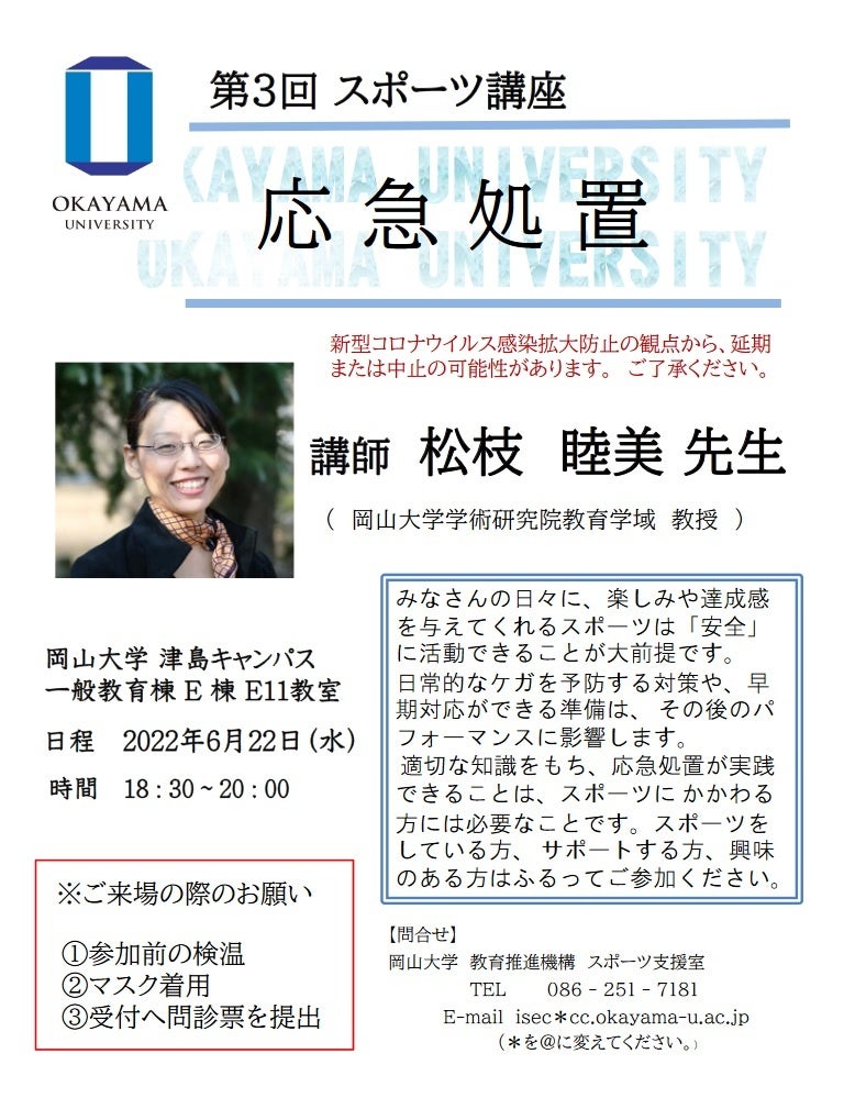 国立大学法人岡山大学(本部:岡山市北区津島中、学長:槇野博史)教育推進機構スポーツ支援室では、スポーツ講座を開催しています。今回、第3回となるスポーツ講座「応急処置」を2022年6月22日(水)に岡山大学津島キャンパス(岡山市北区)にて開催します。