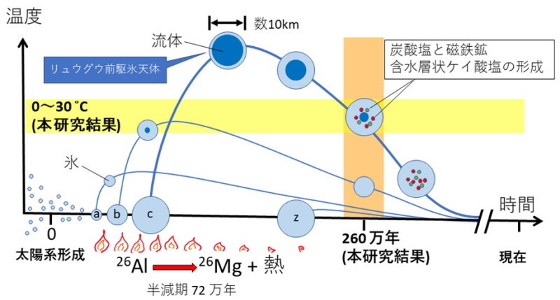 - 氷前駆天体の大きさは数十キロメートルであり、太陽系形成後約260万年までの期間に水質変質を被った。