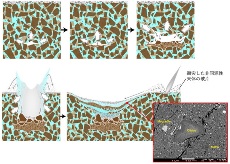 (下段)天井部分が崩落してすり鉢状の窪地ができると、氷の昇華によって窪地壁面から水蒸気とともに、地下の物質(氷を含む)が噴出する