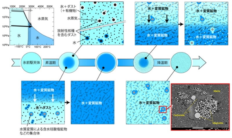 (左下)ダスト中の珪酸塩成分や有機物が水流体との反応で含水珪酸塩鉱物などに変化し、天体内部から表層部に向かって広範な水質変質をもたらす