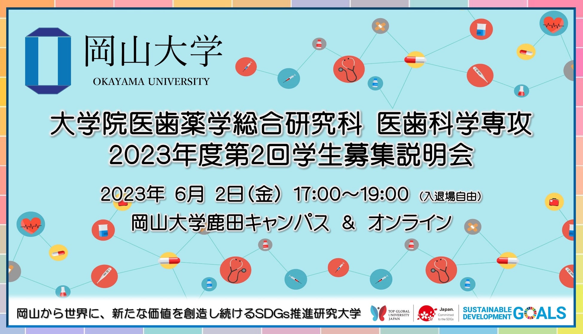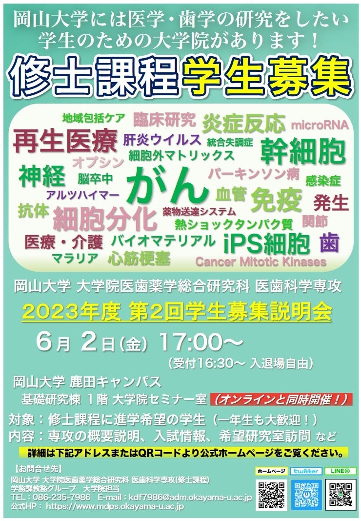 国立大学法人岡山大学(本部:岡山市北区、学長:那須保友)大学院医歯薬学総合研究科・医歯科学専攻(修士課程)では、2023年6月2日(金)17:00から「2023年度第2回学生募集説明会」を本学鹿田キャンパス(岡山市北区)での現地開催とオンライン開催の同時にて実施します。