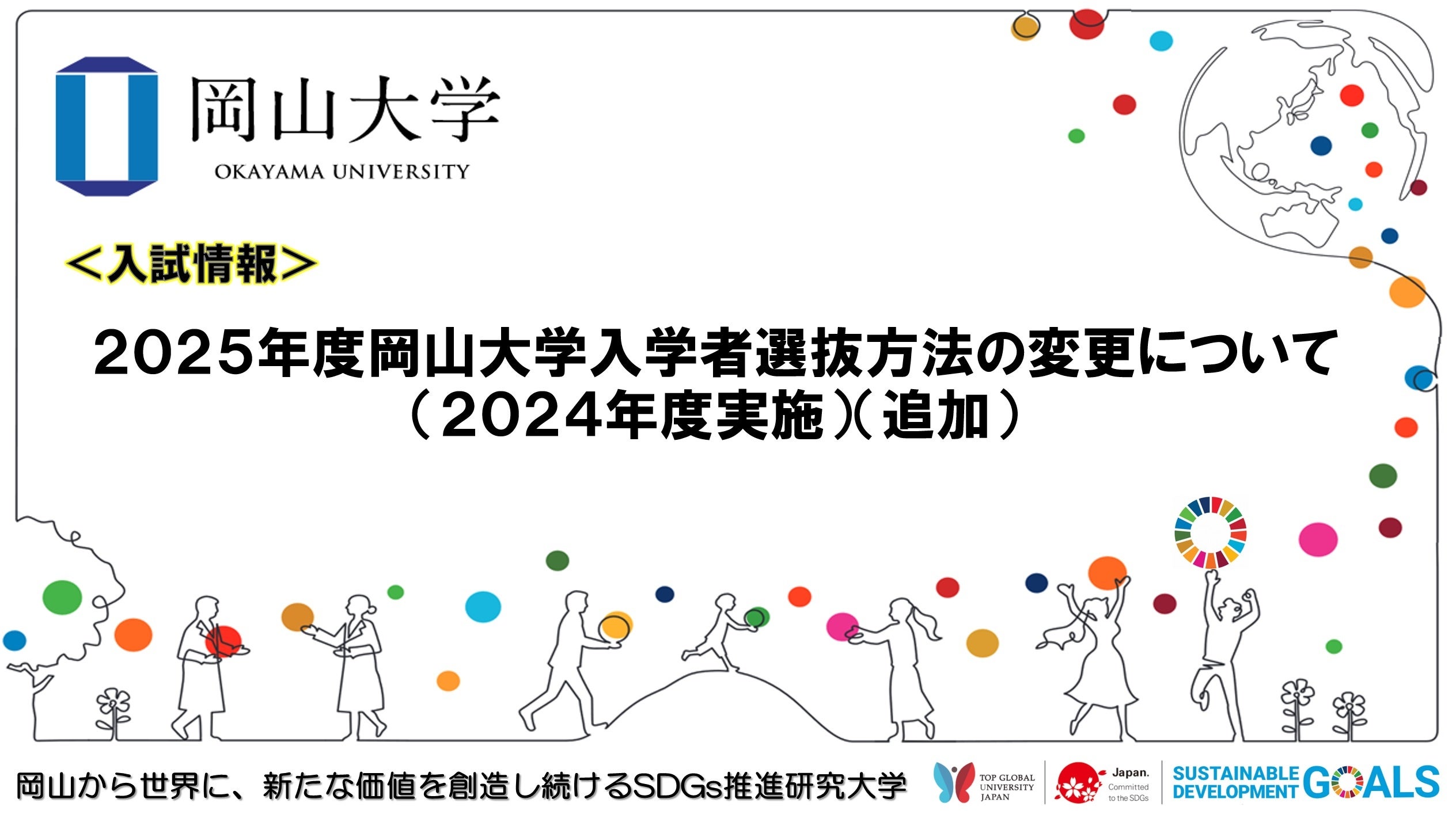 国立大学法人岡山大学(本部:岡山市北区、学長:那須保友)では、2025年度岡山大学入学者選抜方法の変更について(2024年度実施)、以下の通り公開しましたので、お知らせします。