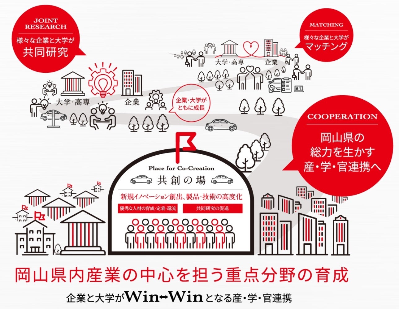 岡山県において、自動車軽量化及び部品加工高度化等の自動車要素技術に関する共同研究を目指す多くの企業・研究者が参画し、様々な連携による共同研究の促進を図る「共創の場」として、岡山県の「大学と連携した地域産業振興事業」の一環として立ち上げたコンソーシアム。産・学・官連携により岡山県内中小企業の技術開発力、企画提案力を飛躍的に向上させ、自動車産業の発展と経済の好循環を目指す。