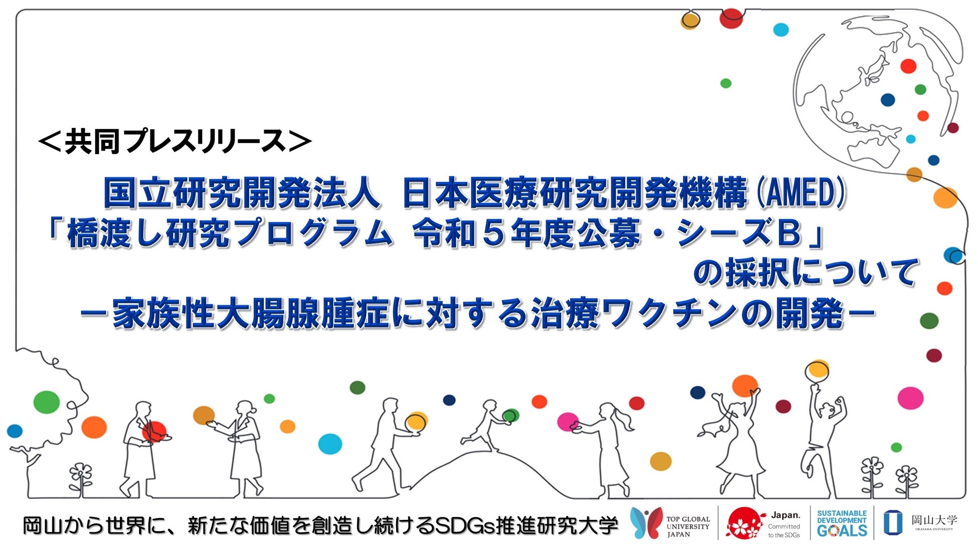 国立研究開発法人日本医療研究開発機構(以下、「AMED」)が公募していた「橋渡し研究プログラム 令和5年度公募・シーズB」に、香川大学の西山成教授が大阪大学の中神啓徳寄附講座教授・京都府立医科大学の石川秀樹特任教授と共同で、橋渡し研究支援機関 岡山大学(以下、「岡山大学拠点」)を通じて提案した研究開発課題「家族性大腸腺腫症に対する治療ワクチンの開発」が採択されましたのでお知らせいたします。