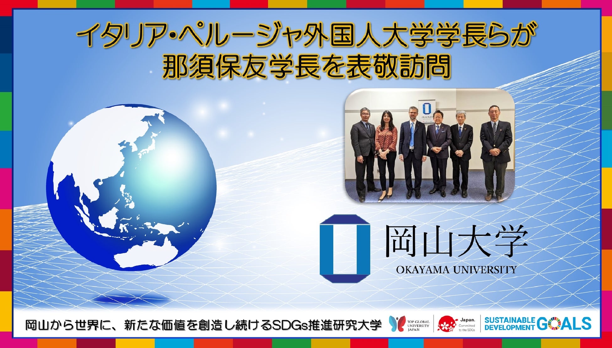 2023年4月24日、イタリア・ペルージャ外国人大学のバレリオ・デ・チェザリス学長らが岡山大学を訪れ、那須保友学長を表敬訪問しました。