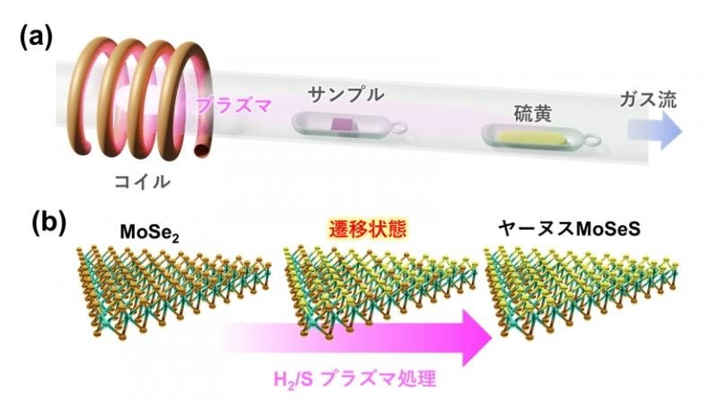 図2. (a) 硫黄を含むプラズマ処理装置の模式図。(b) 原子置換によりMoSe2からヤーヌスMoSeSに至る過程の模式図