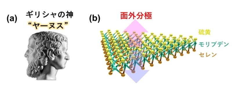 図1. (a) ヤーヌスTMDCの名前の由来になったギリシャの神ヤーヌス。(b) ヤーヌスMoSeSの結晶構造の模式図