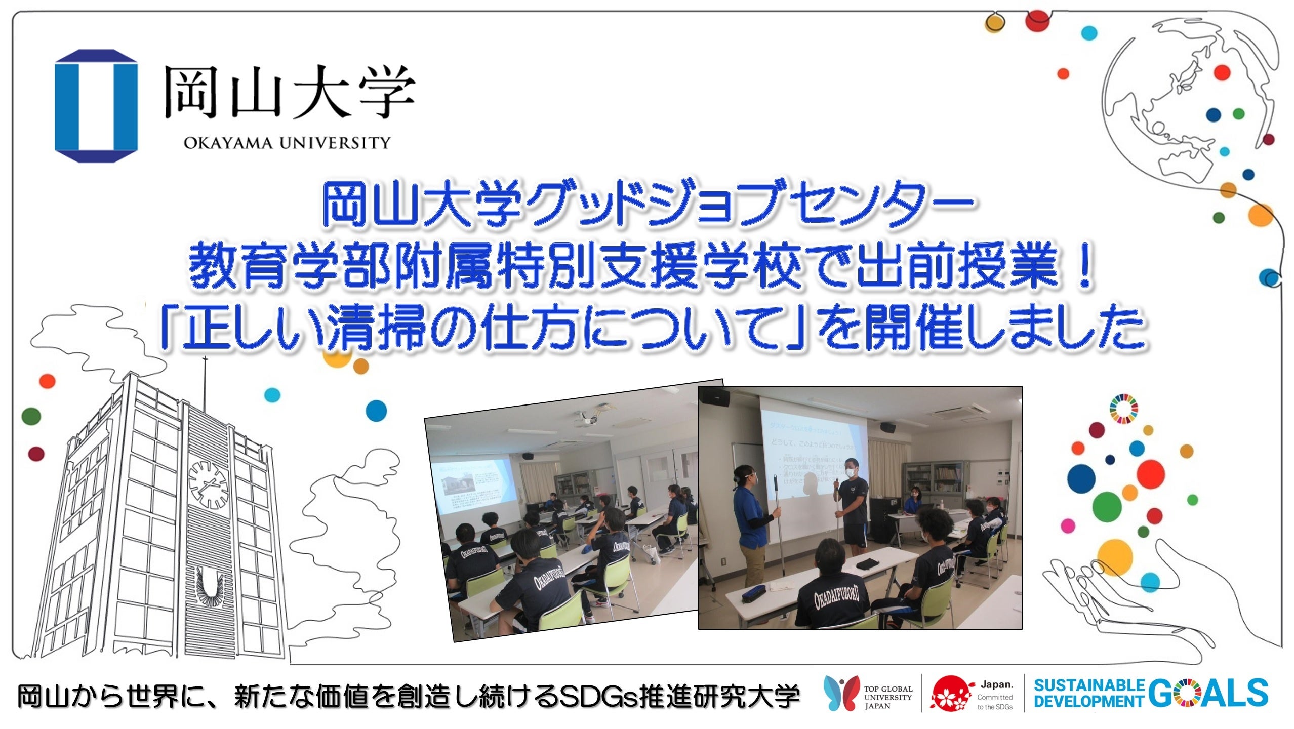 国立大学法人岡山大学(本部:岡山市北区、学長:那須保友)のグッドジョブセンターは2023年5月16日、本学教育学部附属特別支援学校高等部の「生活学習」の授業において、「正しい清掃の仕方」と題して授業を担当し、生徒17人が受講しました。同センターの清掃を担当する中島千明サブリーダー(事務・軽作業班)と山下靖子サブリーダー(定着支援担当)が講師として登壇しました。