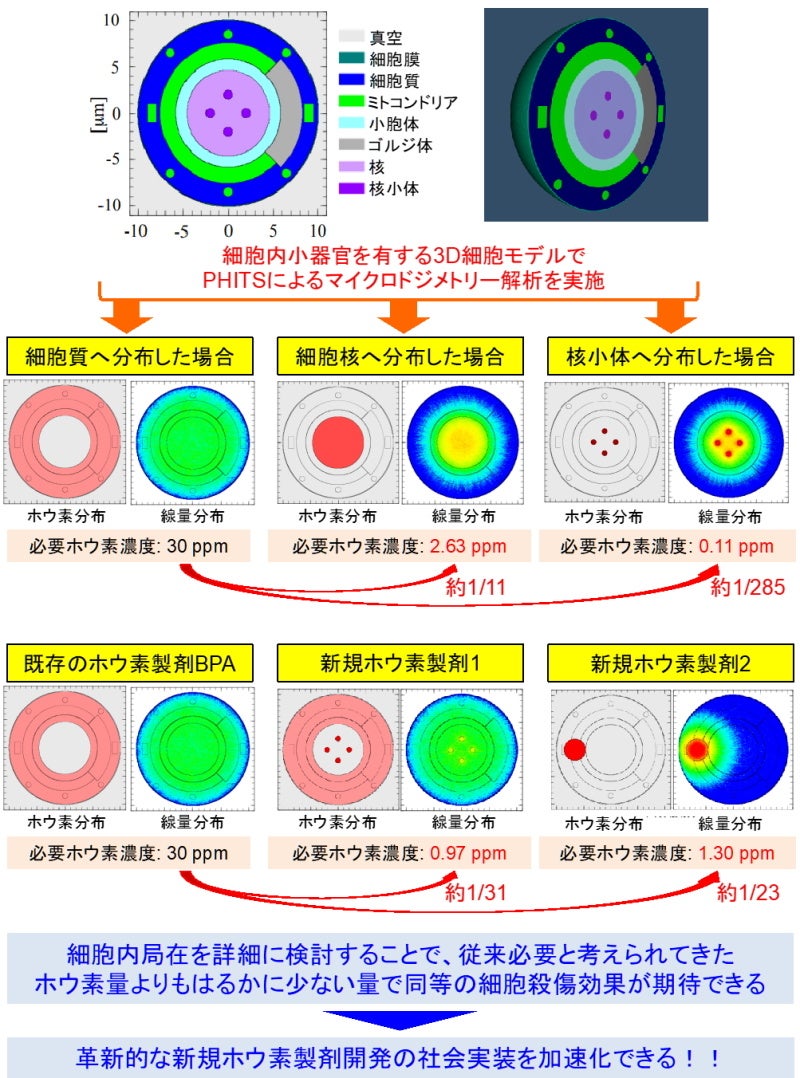 - 細胞内局在に着目したホウ素製剤の開発により、従来必要と考えられてきたホウ素送達量よりもはるかに少ない量で細胞死を誘導できうることがシミュレーション解析で判明しました。