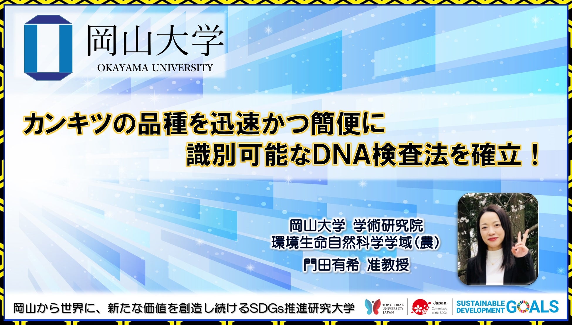 国立大学法人岡山大学(本部:岡山市北区、学長:那須保友)の学術研究院環境生命自然科学学域(農)の門田有希准教授、進藤彰子研究員、農研機構果樹茶業研究部門の島田武彦研究領域長、愛媛県農林水産研究所の岡本充智主任研究員、株式会社ファスマックの高崎一人氏、竹内朋幸氏らの研究グループは、カンキツの品種を簡便かつ迅速に識別できる新たなDNA検査法を開発しました。