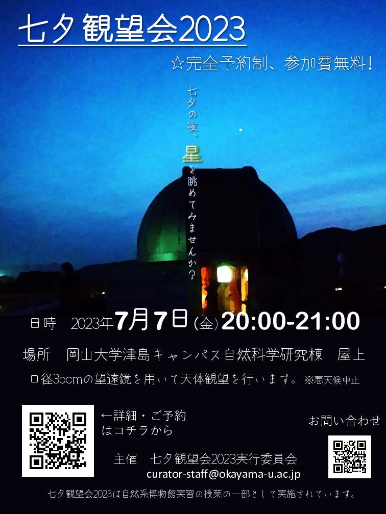 国立大学法人岡山大学(本部:岡山市北区、学長:那須保友)では、2023年7月7日(金)20:00~21:00に本学津島キャンパスにおいて、口径35cm望遠鏡を使った「七夕観望会2023」を開催します。