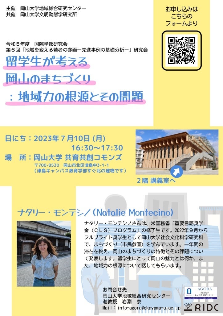 今回、2023年7月10日(月)16:30〜17:30に本学津島キャンパスにおいて、米国務省「重要言語奨学金(CLS)プログラム」修了生であり、現在フルブライト奨学生として岡山大学社会文化科学研究科で市民参画を学んでいるナタリー・モンテシノさんが語る、岡山のまちづくりの特徴や課題、留学生にとっての岡山の魅力などについて発表します。
