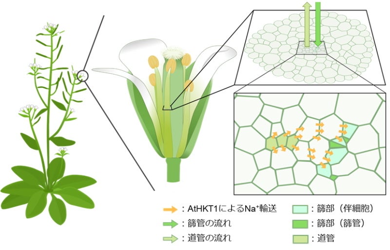 AtHKT1は、花の道管(雄しべ)のナトリウムを篩管に転送して根へ送り返すと考えられる。これにより、雄しべのナトリウムの過剰蓄積が抑えられ,種子形成が守られる