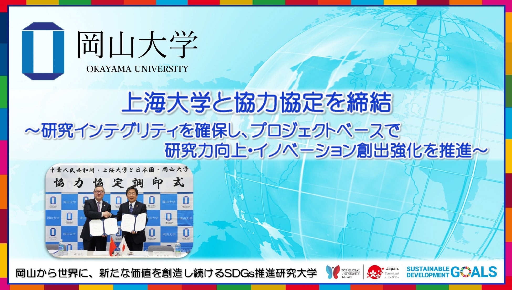 岡山大学は「地域中核・特色ある研究大学:岡山大学」の活動のひとつとして、研究力向上・イノベーション創出強化などの国際戦略を展開する中で、安全保障上の取り決めや懸念事項などをしっかりと調整したうえで、世界の多様なステークホルダーらとともに地球全体のウェルビーイングを推進して参ります。どうぞ今後も地域中核・特色ある研究大学である岡山大学にご期待ください。