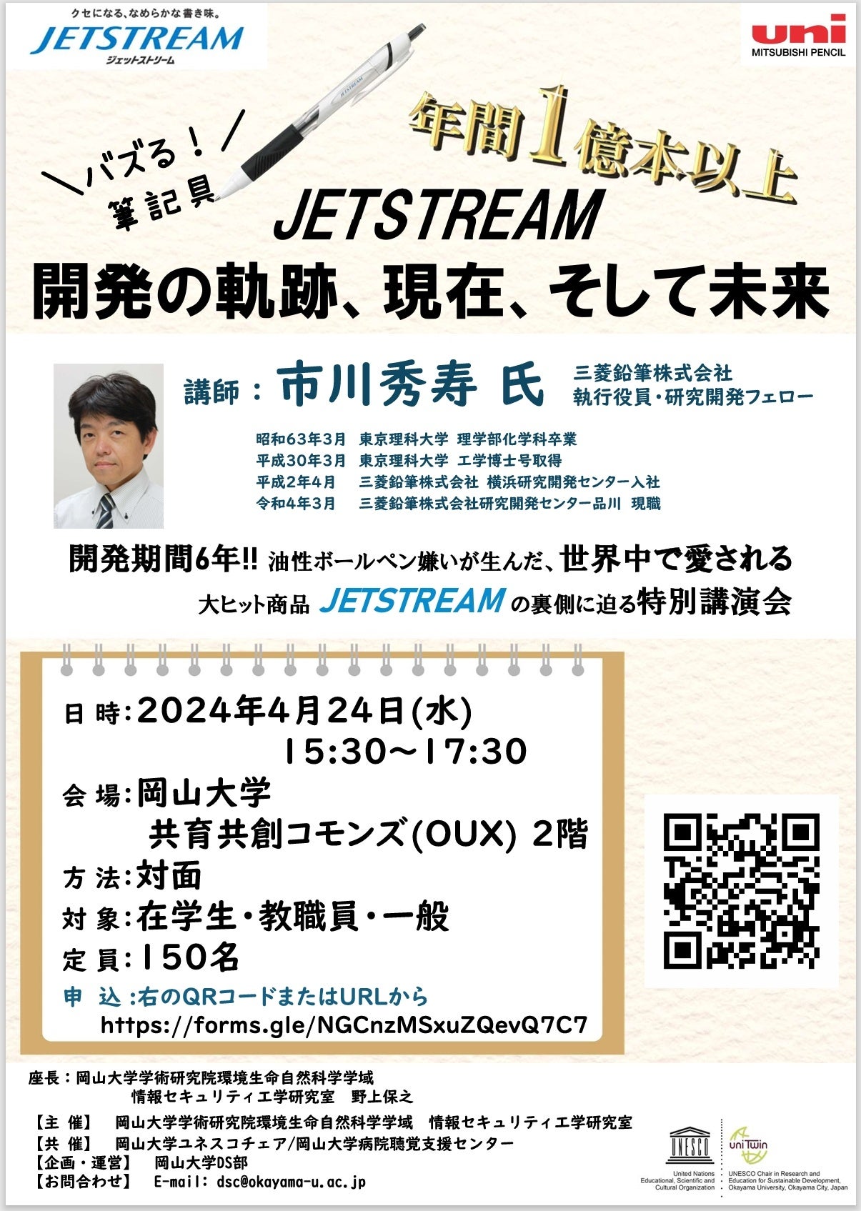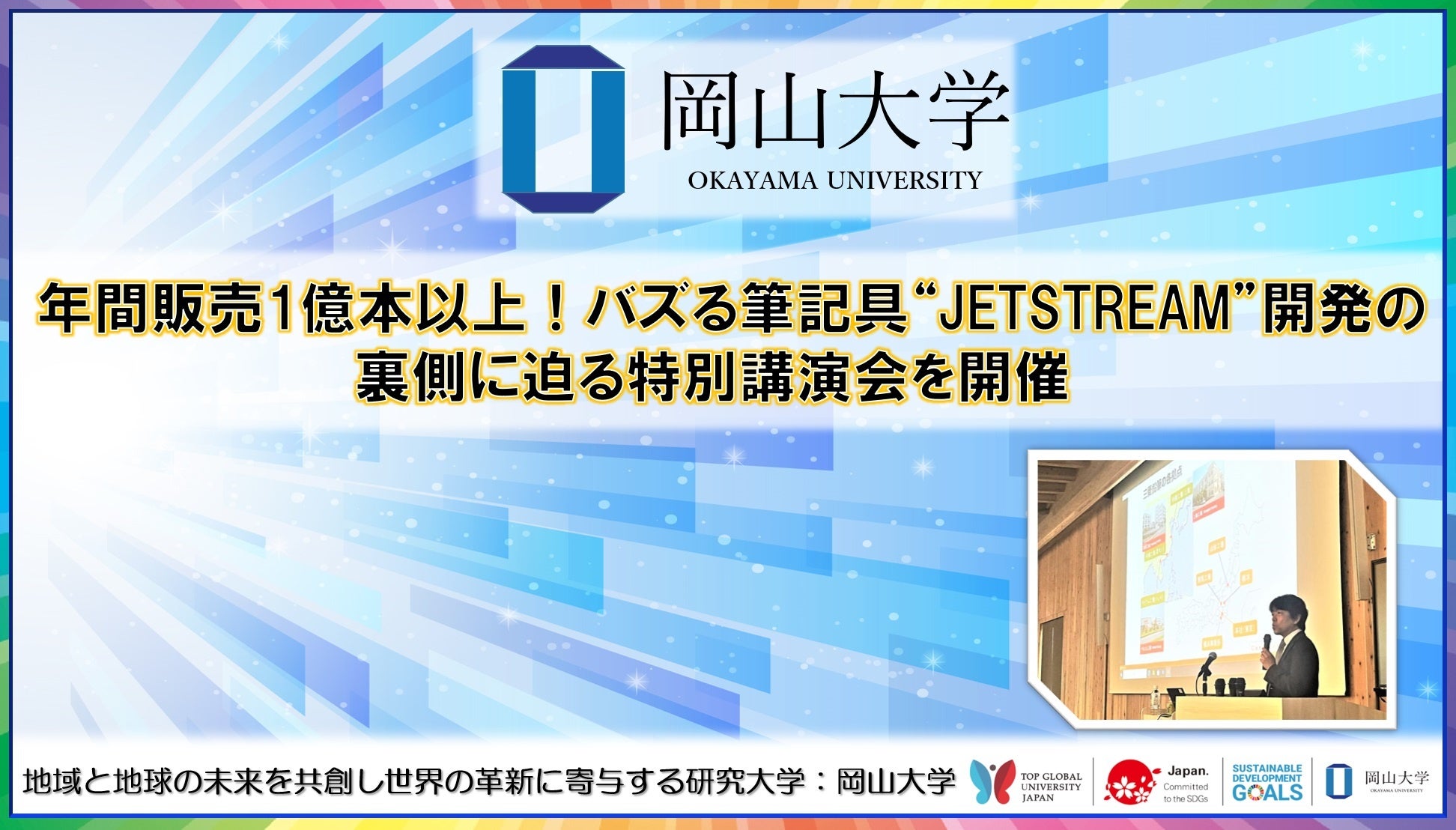 国立大学法人岡山大学(本部:岡山市北区、学長:那須保友)は2024年4月24日、本学津島キャンパスの共育共創コモンズ(OUX)において、三菱鉛筆株式会社リサーチフェローの市川秀寿氏による講演『バズる筆記具 年間1億本以上 JETSTREAM開発の軌跡・現在・そして未来』を開催しました。