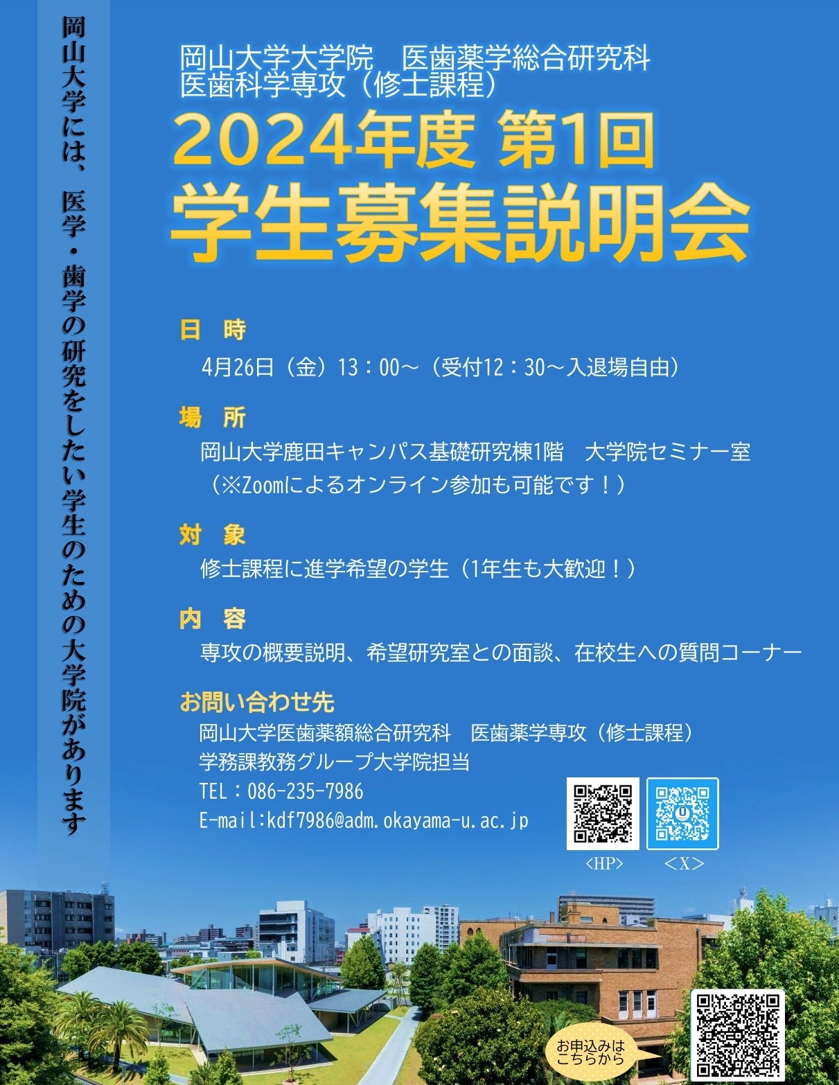【岡山大学】大学院医歯薬学総合研究科(医・歯学系)修士学生募集説明会 in 津島キャンパス〔4/23,火 岡山大学津島キャンパス〕