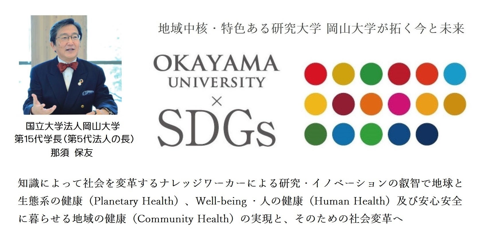 国立大学法人岡山大学は、国連の「持続可能な開発目標(SDGs)」を支援しています。また、政府の第1回「ジャパンSDGsアワード」特別賞を受賞しています。地域中核・特色ある研究大学として共育共創を進める岡山大学にご期待ください