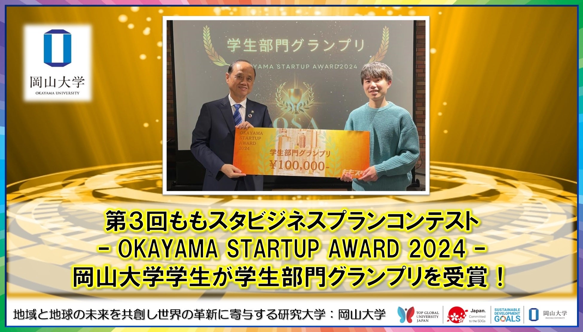 岡山市が運営するスタートアップ支援拠点「ももたろう・スタートアップカフェ」(ももスタ)が2024年3月23日に開催した「第3回ももスタビジネスプランコンテスト – OKAYAMA STARTUP AWARD 2024 –」において、工学部3年の大西一碧さんが学生部門グランプリを受賞しました。