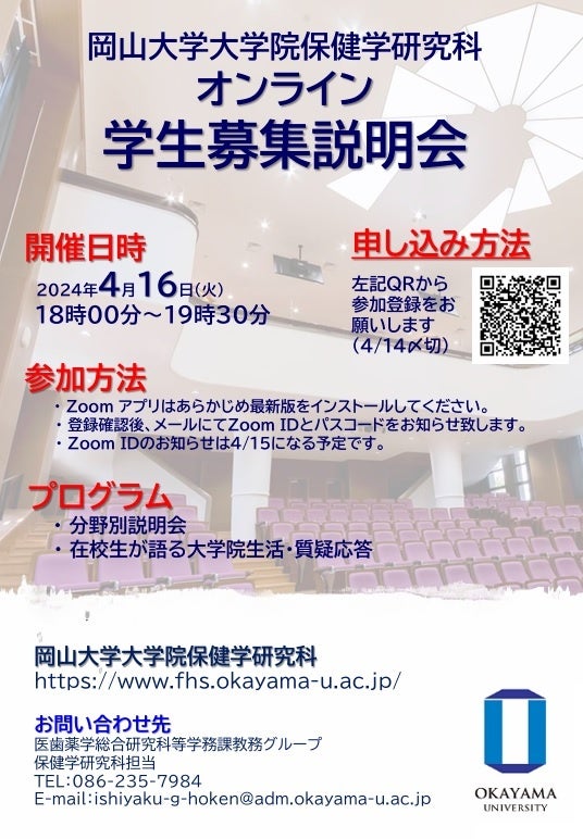 国立大学法人岡山大学(本部:岡山市北区、学長:那須保友)の大学院保健学研究科では、分野別説明会や在校生による大学院説明・質疑応答などについて触れる「岡山大学大学院保健学研究科オンライン学生募集説明会」を2024年4月16日(火)18:00~19:30に実施します。