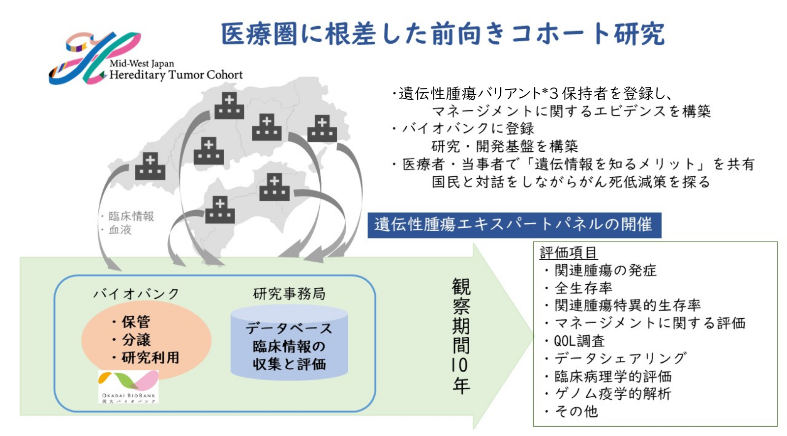 2020年12月に岡山大学病院を含む中国・四国地方を中心とした16施設が協力して、遺伝性腫瘍に対する取り組み「中央西日本遺伝性腫瘍コホート研究」がスタートしました。我が国におけるがん予防に係るエビデンスを発信することで、国民の健康管理に役立つことを目指しています(2024年4月現在50施設が参加)。