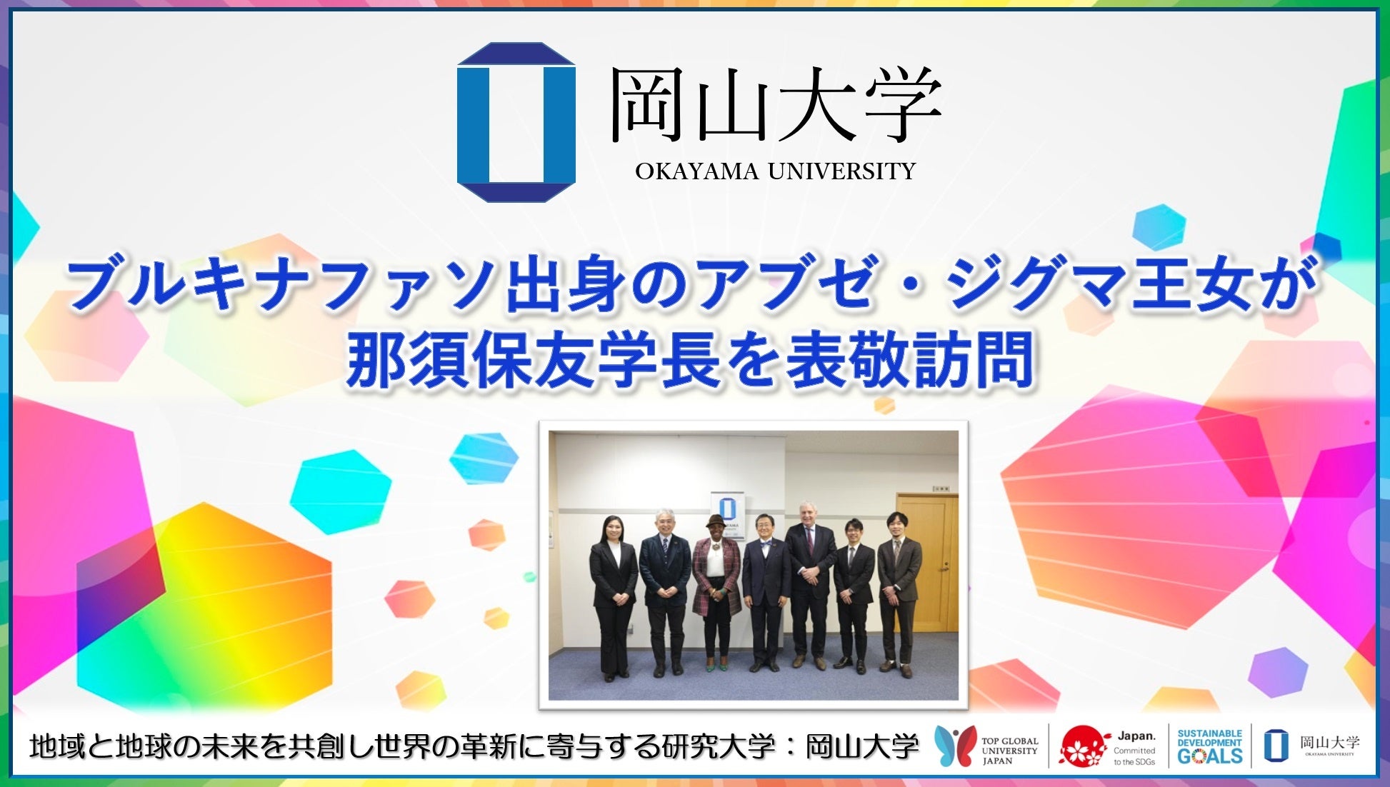国立大学法人岡山大学(本部:岡山市北区、学長:那須保友)の名誉博士であるブルキナファソ出身のアブゼ・ジグマ王女が本学津島キャンパスを訪れ、那須保友学長を表敬訪問しました。