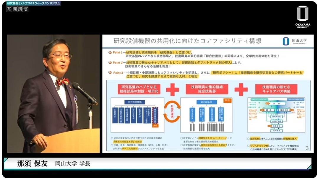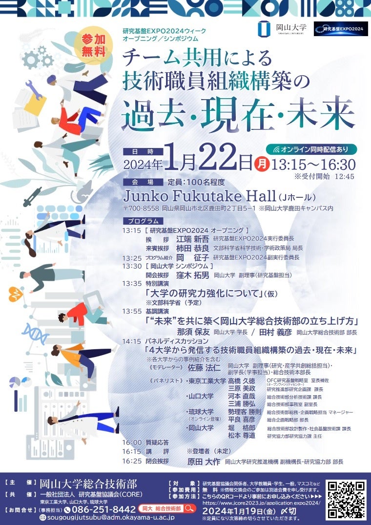 国立大学法人岡山大学(本部:岡山市北区、学長:那須保友)の総合技術部は2024年1月22日、岡山大学シンポジウム「チーム共用による技術職員組織構築の過去・現在・未来」を本学鹿田キャンパスにあるJunko Fukutake Hall(Jホール)とオンラインでのハイブリッド形式で開催しました。