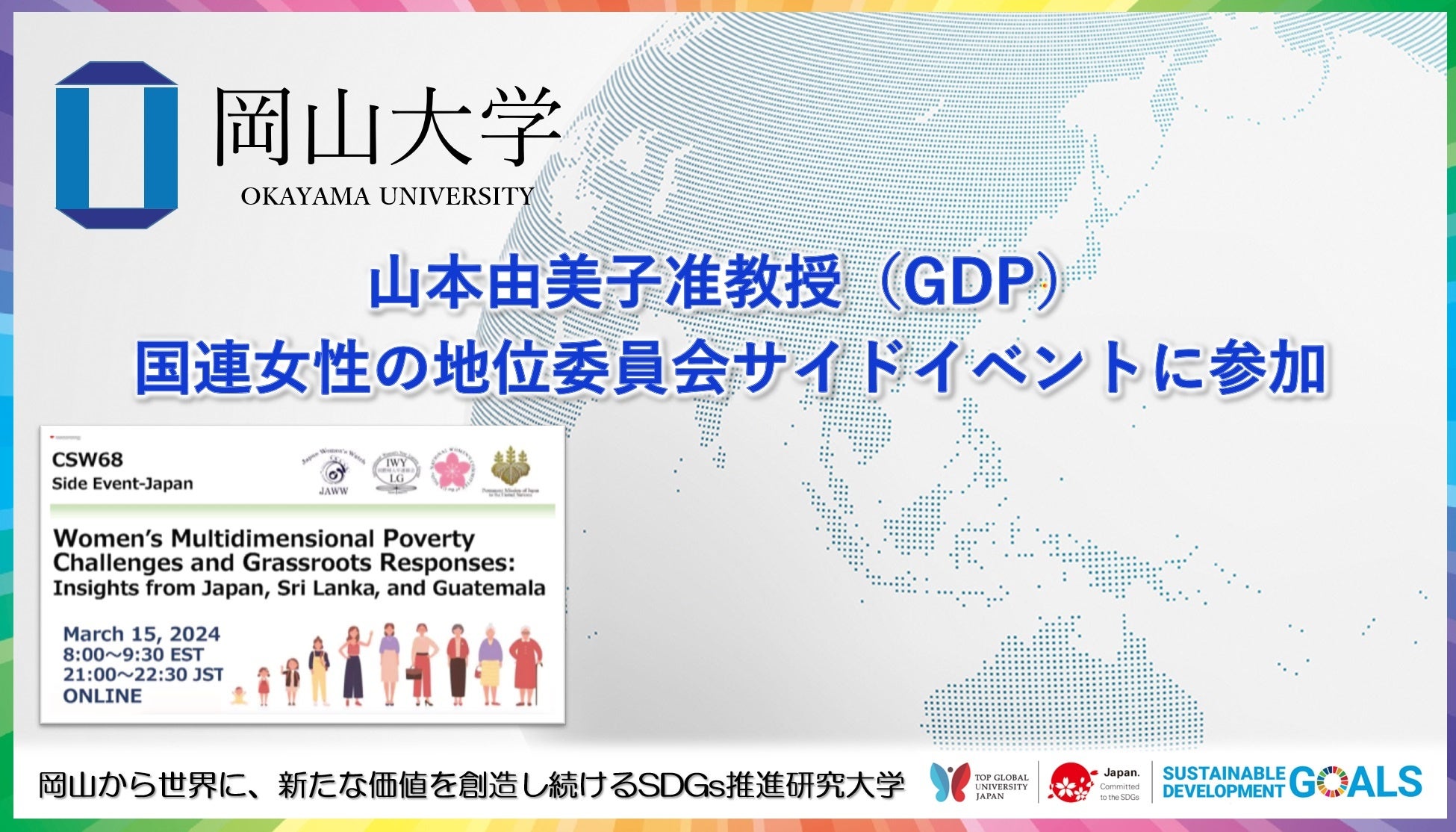国立大学法人岡山大学(本部:岡山市北区、学長:那須保友)グローバル人材育成院の山本由美子准教授(グローバル・ディスカバリー・プログラム(GDP)・大学院社会文化科学研究科担当)が2024年3月15日、第68回国連女性の地位委員会(CSW68)のサイドイベントに参加しました。このイベントは、3月11~22日に国連本部(ニューヨーク)で開催されたCSW68の一環として、オンラインで開催されました。