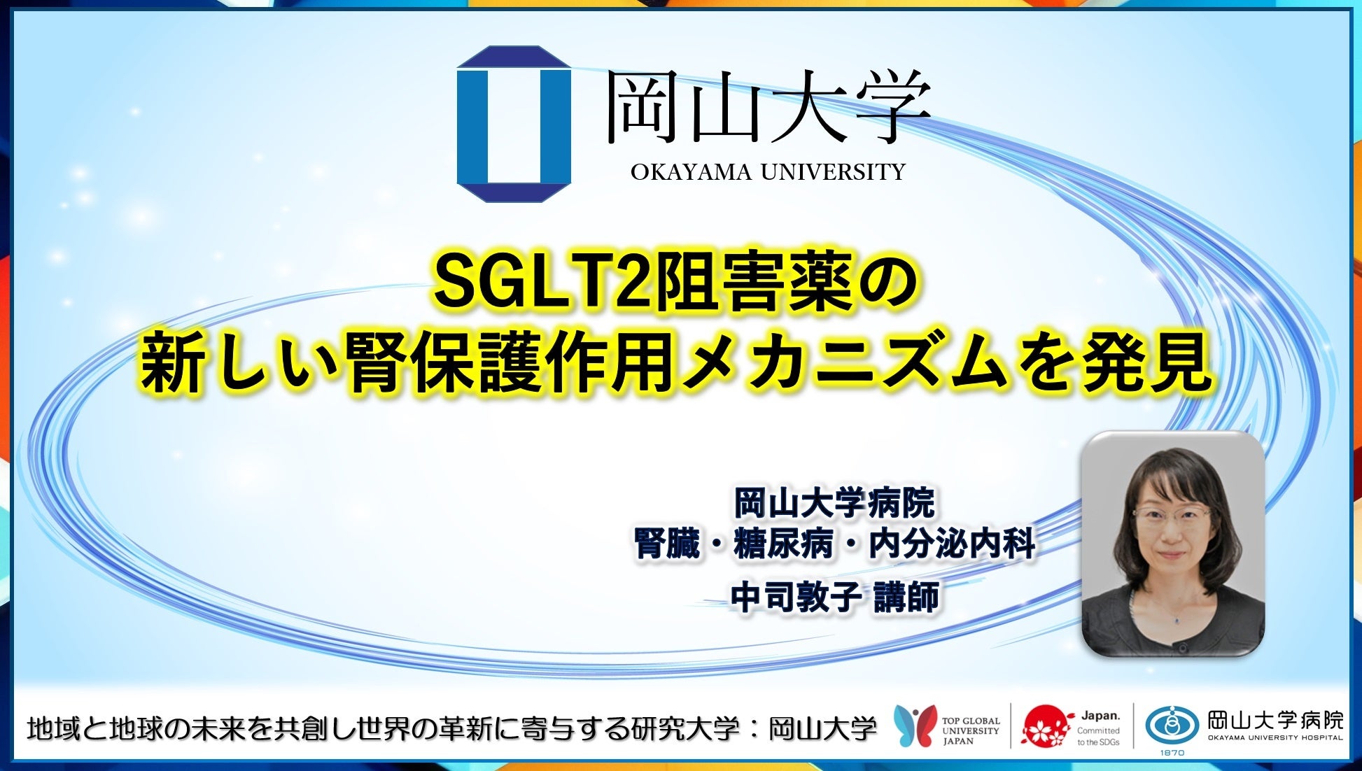 国立大学法人岡山大学(本部:岡山市北区、学長:那須保友)の岡山大学病院 腎臓・糖尿病・内分泌内科の中司敦子講師、和田淳教授はNPO法人日本腎臓病協会Kidney Research Initiative-Japan(KRI-J)および田辺三菱製薬株式会社との共同研究において、SGLT2阻害薬であるカナグリフロジンが糖尿病関連腎臓病の進行を抑制する新しい作用メカニズムを発見しました。