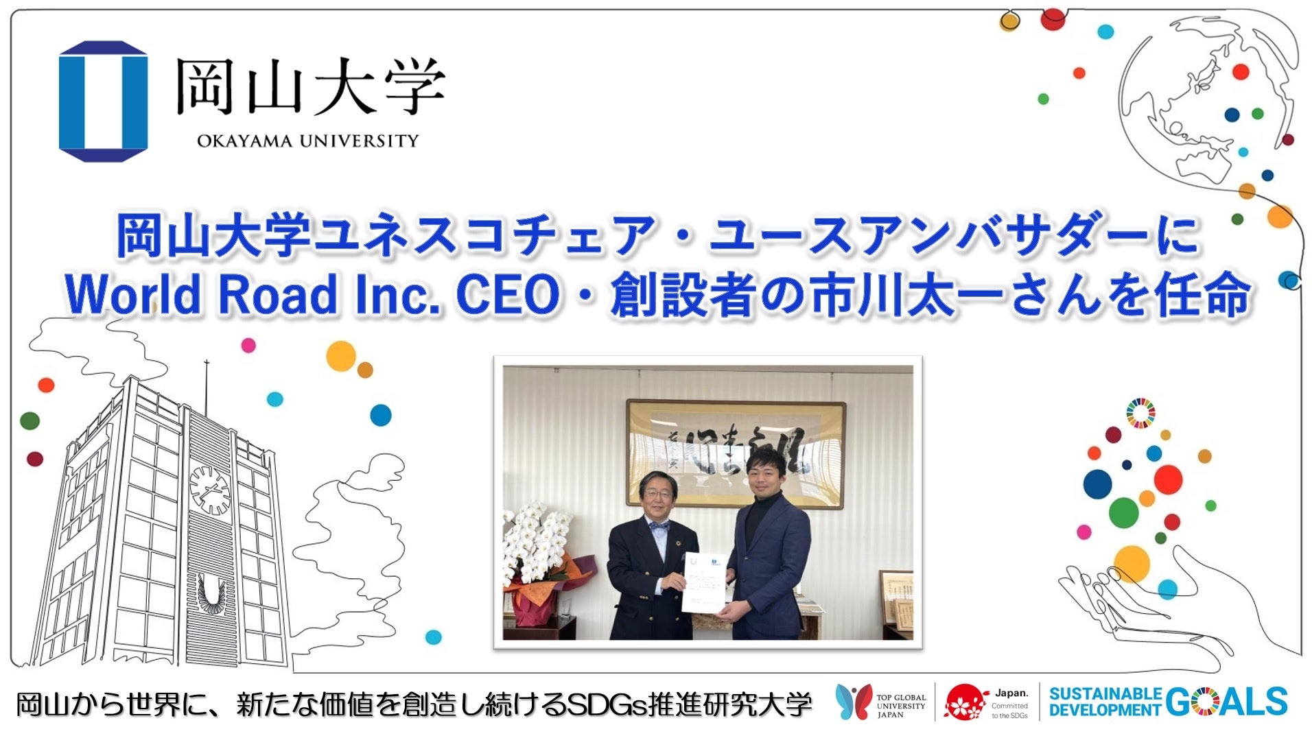 CEO・創設者の市川太一さんを「岡⼭⼤学ユネスコチェア・ユースアンバサダー」に任命しました。昨年4月に任命したユネスコSDG4ユースネットワーク代表のソフィア・ベルムデスさんに続いて2人目(日本人では初)となります。任期は2024年2月から2年間です。