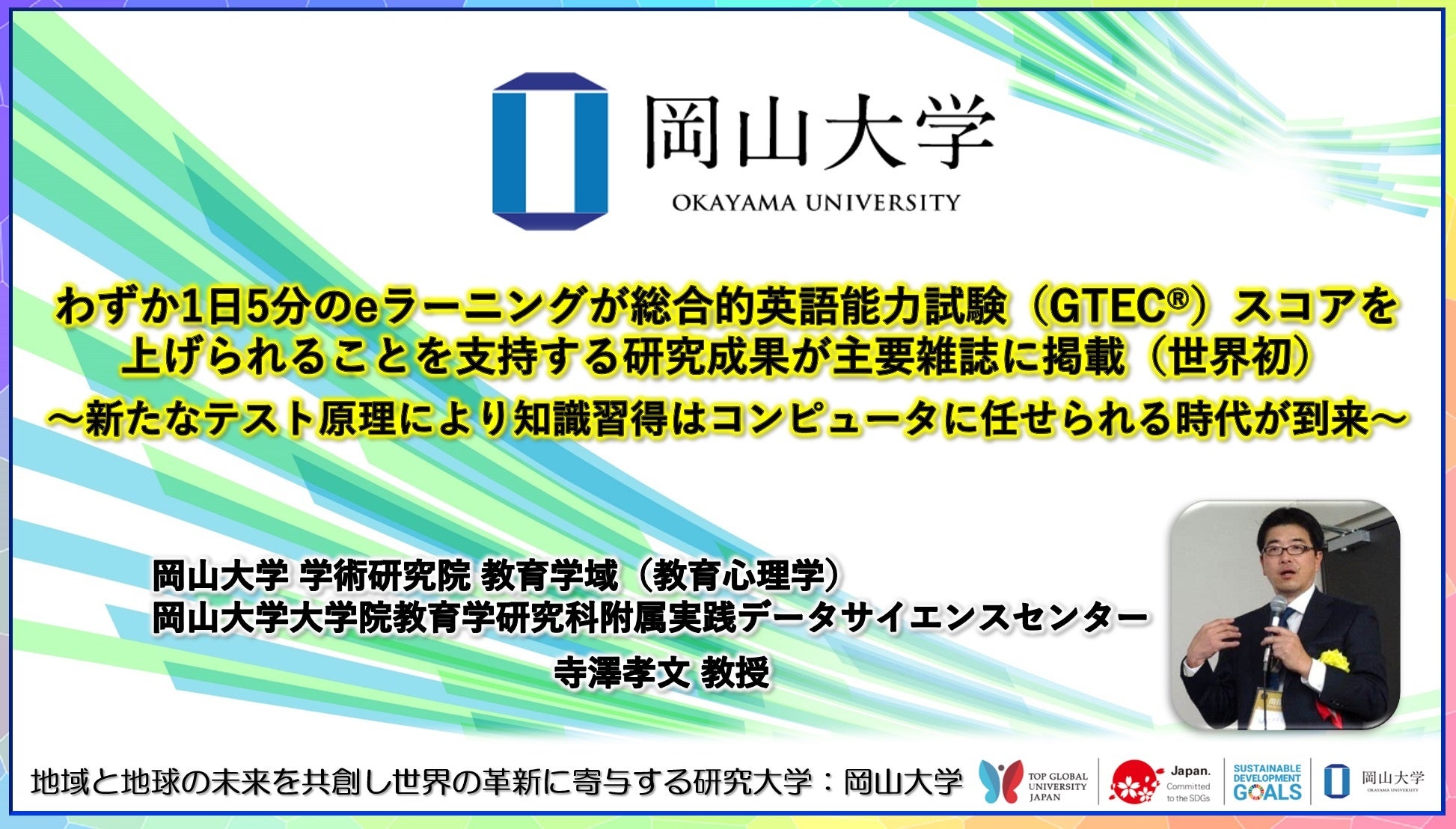 内閣府の戦略的イノベーション創造プログラム(SIP)第2期(ビッグデータ・AIを活用したサイバー空間基盤技術/学習支援技術、プログラムディレクター:安西祐一郎、管理法人:国立研究開発法人新エネルギー・産業技術総合開発機構[NEDO])の委託事業(2018-2020)により、岡山大学が教養英語の課外学習支援システムとして導入したeラーニング(MSS)が、総合的な英語力を測るGTECのスコアを上げられることを支持する有意な研究結果(世界初)が主要雑誌(心理学研究)に掲載されました。