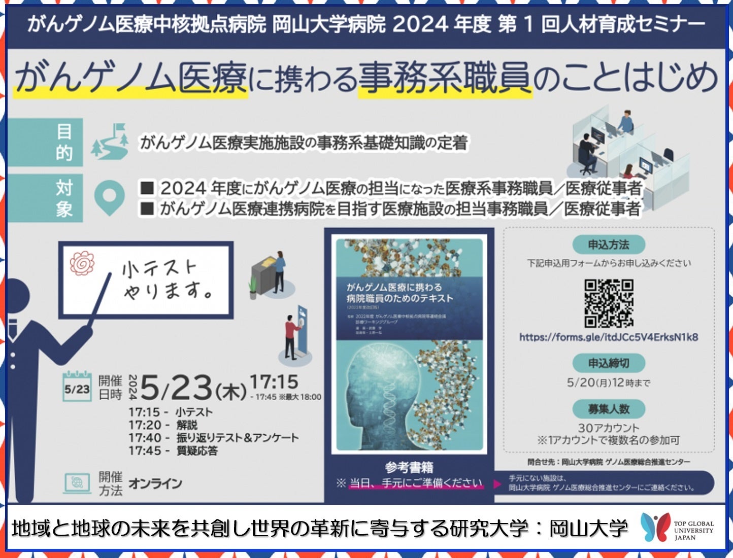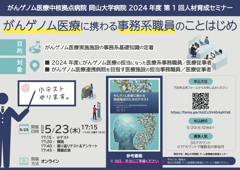 今回、がんゲノム医療の担当になった医療系事務職員/医療従事者やがんゲノム医療連携病院を目指す医療施設の担当事務職員/医療従事者を対象に「がんゲノム医療に携わる事務系職員のことはじめ(小テストの解説)」を2024年5月23日(木)17:15~17:45にオンラインで開催します。