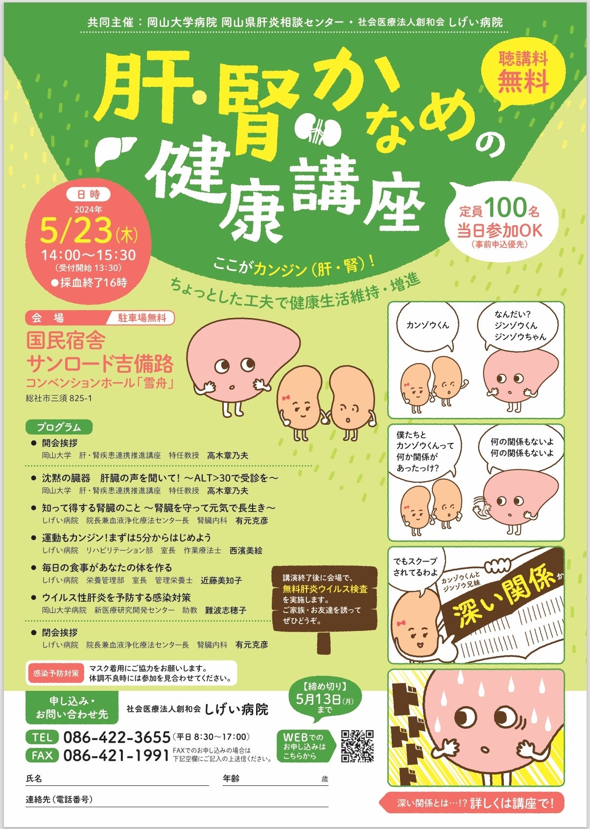 岡山県肝炎相談センター(岡山大学病院内)は、昨年度、一昨年度と開催し、大変好評をいただいた「肝・腎かなめの健康講座」を社会医療法人創和会しげい病院とのコラボレーションで今年も開催します。