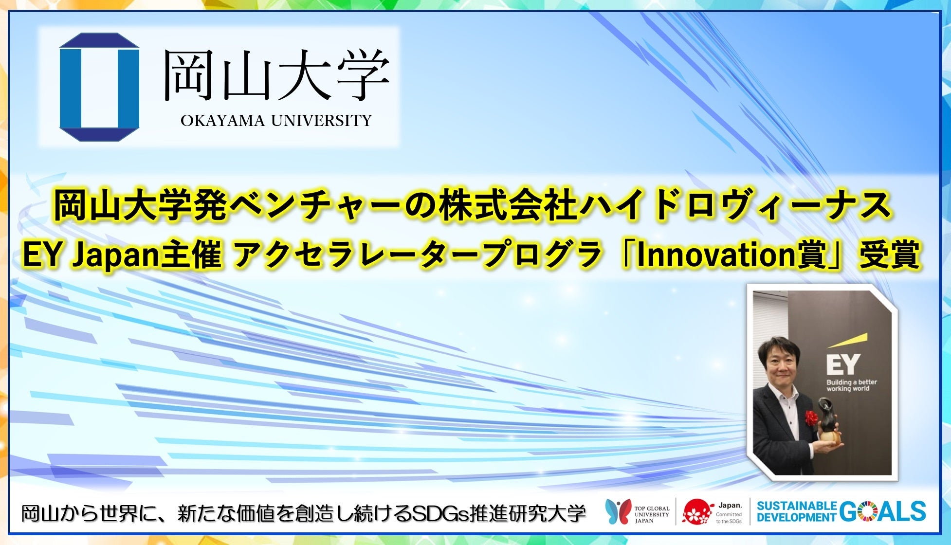 岡山大学発ベンチャーの株式会社ハイドロヴィーナスが、中国地方の起業家育成を目的としたアクセラレータープログラム(EY Japan主催)の最終発表会において、新規性や独創性を称える「Innovation賞」を受賞しました。