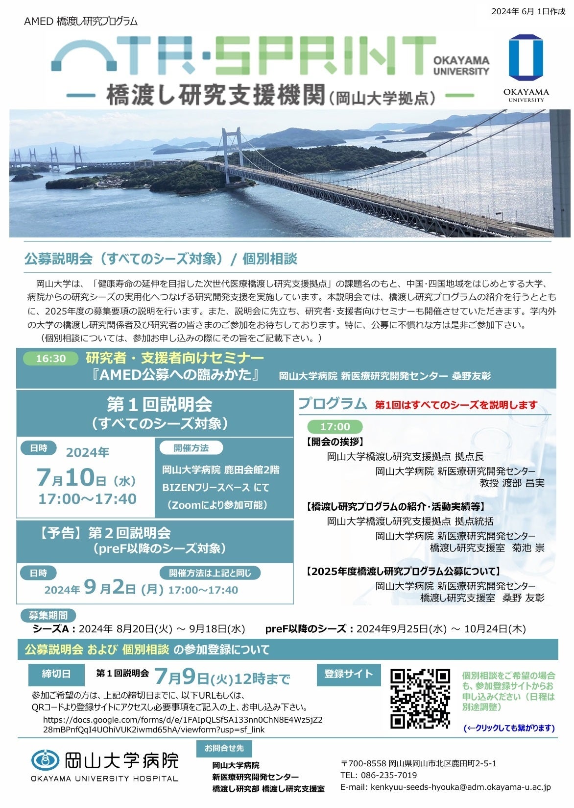 この度、2025年度橋渡し研究プログラム(岡山大学拠点)第1回公募説明会(すべてのシーズ対象)を以下のとおり開催いたしますのでお知らせいいたします。