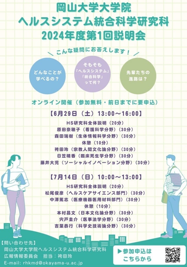 国立大学法人岡山大学(本部:岡山市北区、学長:那須保友)の大学院ヘルスシステム統合科学研究科では、オンラインでの大学院説明会を、2024年6月29日(土)13:00~16:00にオンラインで開催する運びとなりました。