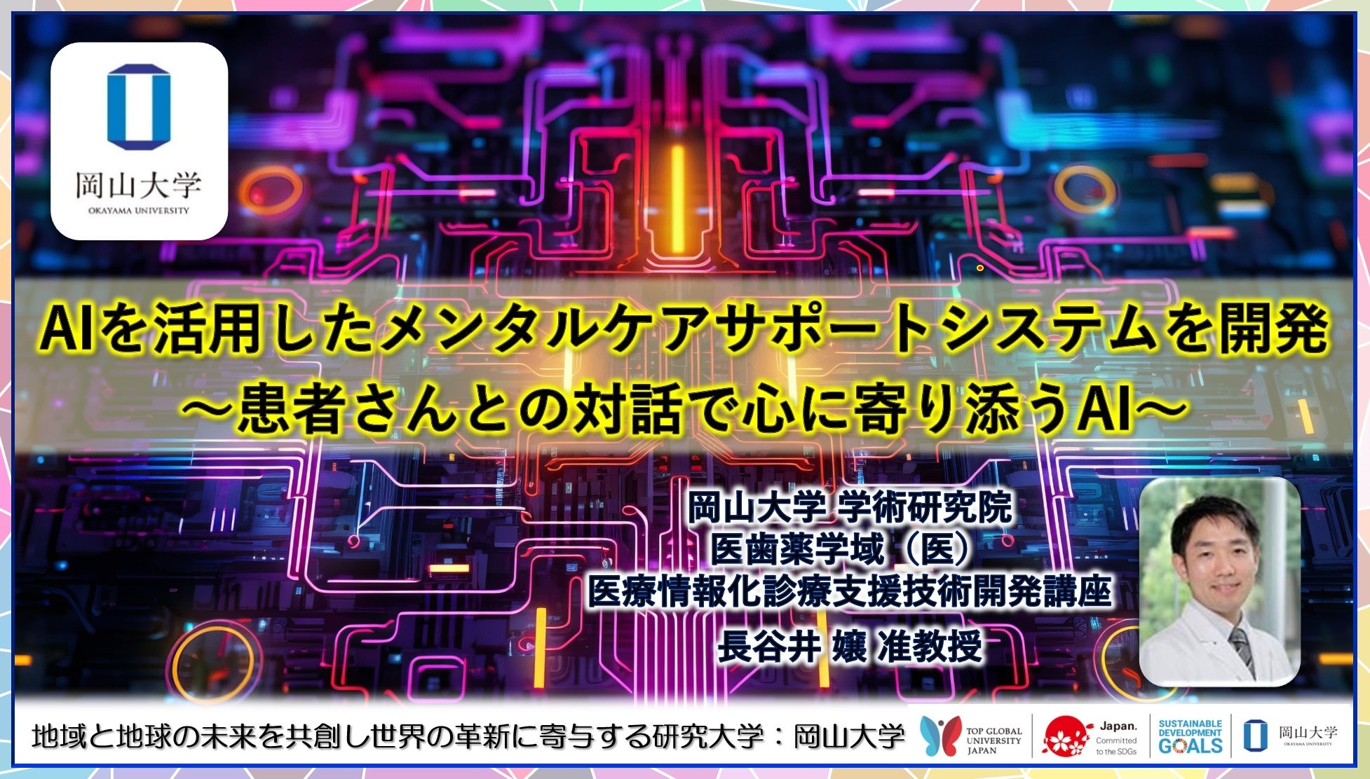 そこで、国立大学法人岡山大学(本部:岡山市北区、学長:那須保友)の学術研究院医歯薬学域(医)医療情報化診療支援技術開発講座の長谷井嬢准教授(整形外科)を中心とするチームが開発したのが、AIを用いたメンタルケアサポートシステム(以下、AIシステム)です。このシステムは、患者さんの悩みや不安の訴えに24時間365日寄り添います。