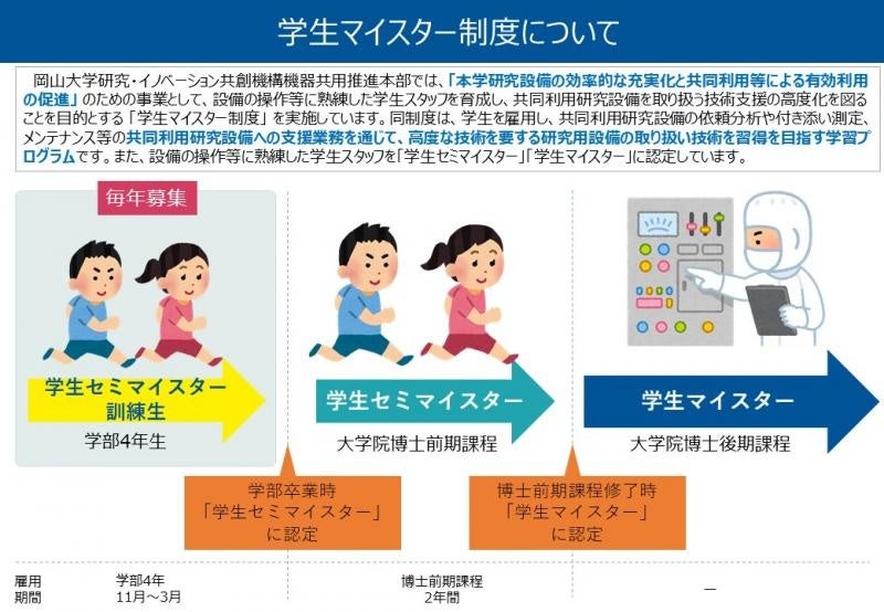 岡山大学は、昨年度に文部科学省「地域中核・特色ある研究大学強化促進事業(J-PEAKS)」(実施主体:日本学術振興会)に採択されており、特色のある研究強化・イノベーション創出の向上や国際展開・社会実装などを戦略的に進めています。それらを支える研究基盤改革として、技術職員の高度化やキャリアパスの整備促進なども重要です。今回の学生マイスター制度においても、研究設備の操作等に熟練した学生を養成し、技術力に裏打ちされた体制を強化することは、人材の高度化や研究基盤の強化等の早期の施策であり、極めて重要な取り組みであると考えています。今後も地域中核・特色ある研究大学:岡山大学と学生マイスター制度により認定された学生らの活動にご期待ください。