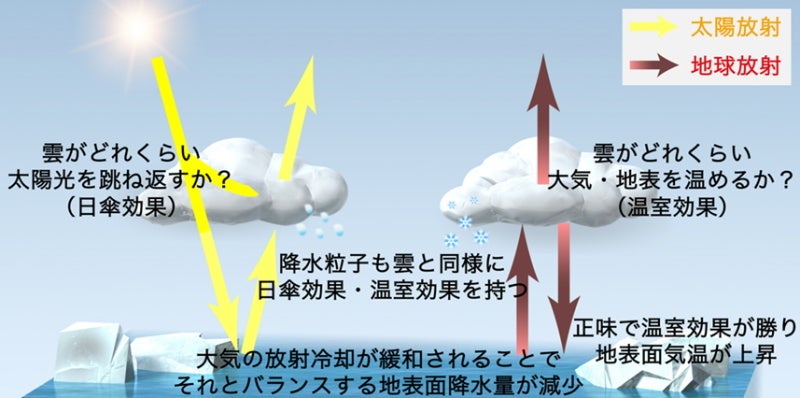 雲は、太陽から地球に入射する「太陽放射」および地球から宇宙へ射出する「地球放射」を大きく変調させる役割を持ちますが、降水粒子が持つ放射効果については未解明でした。
