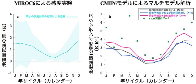 図3. (a)MIROC6を用いた降水粒子の放射効果の有無の差による北極域の地表面気温への影響、および(b)34のCMIP6モデルによる北極温暖化増幅インデックスの差異。