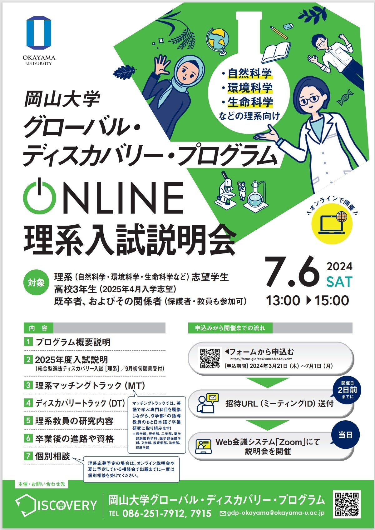 国立大学法人岡山大学(本部:岡山市北区、学長:那須保友)では、世界各国から集まる海外生(留学生・帰国生など)と国内高校の出身生が英語を共通言語としてともに学ぶ学士課程プログラム、グローバル・ディスカバリー・プログラム(GDP)がオンライン理系入試説明会を開催します!