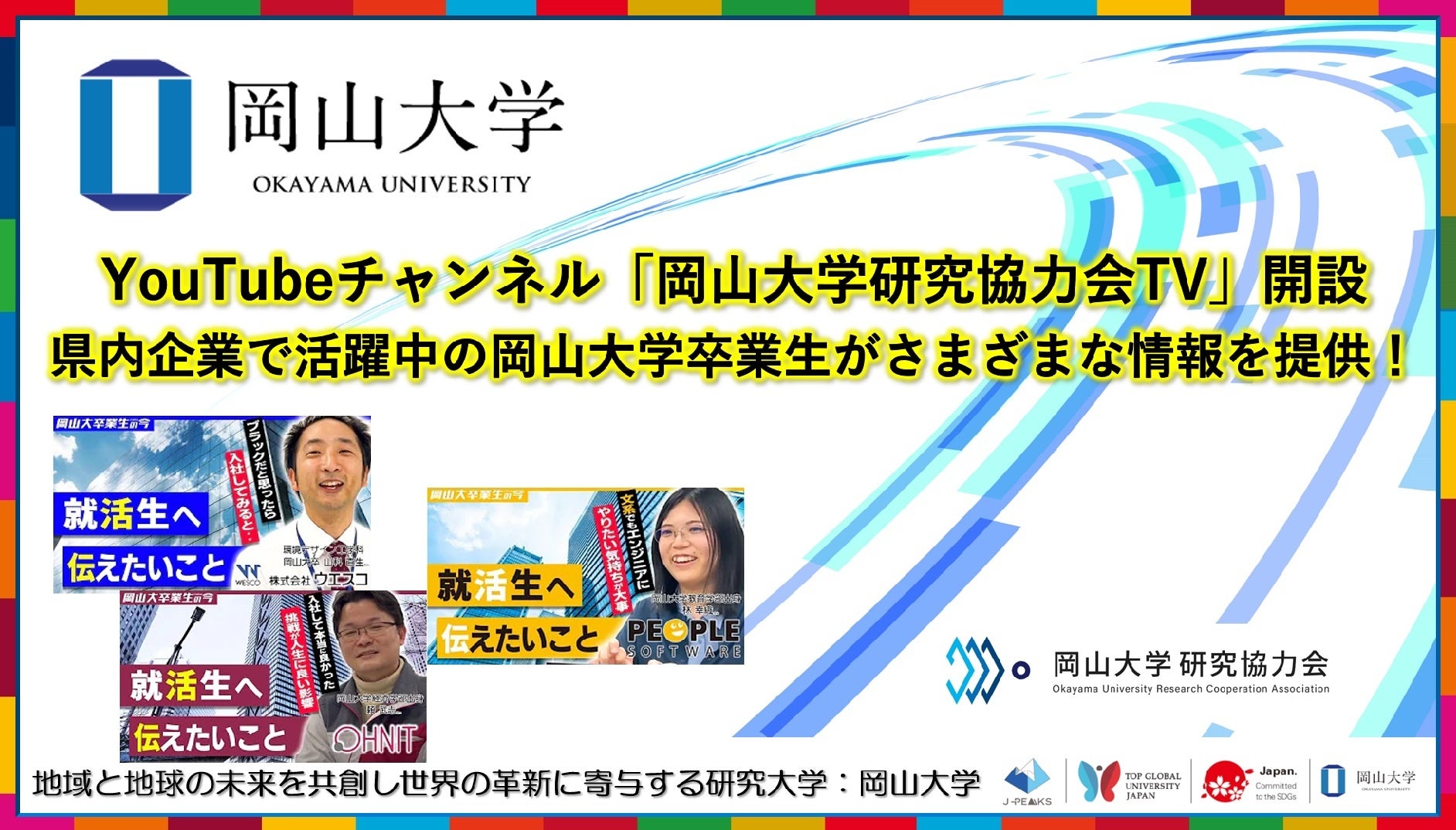 国立大学法人岡山大学(本部:岡山市北区、学長:那須保友)が事務局を務める岡山大学研究協力会は、2024年6月1日にYouTubeチャンネル「岡山大学研究協力会TV」を開設しました。