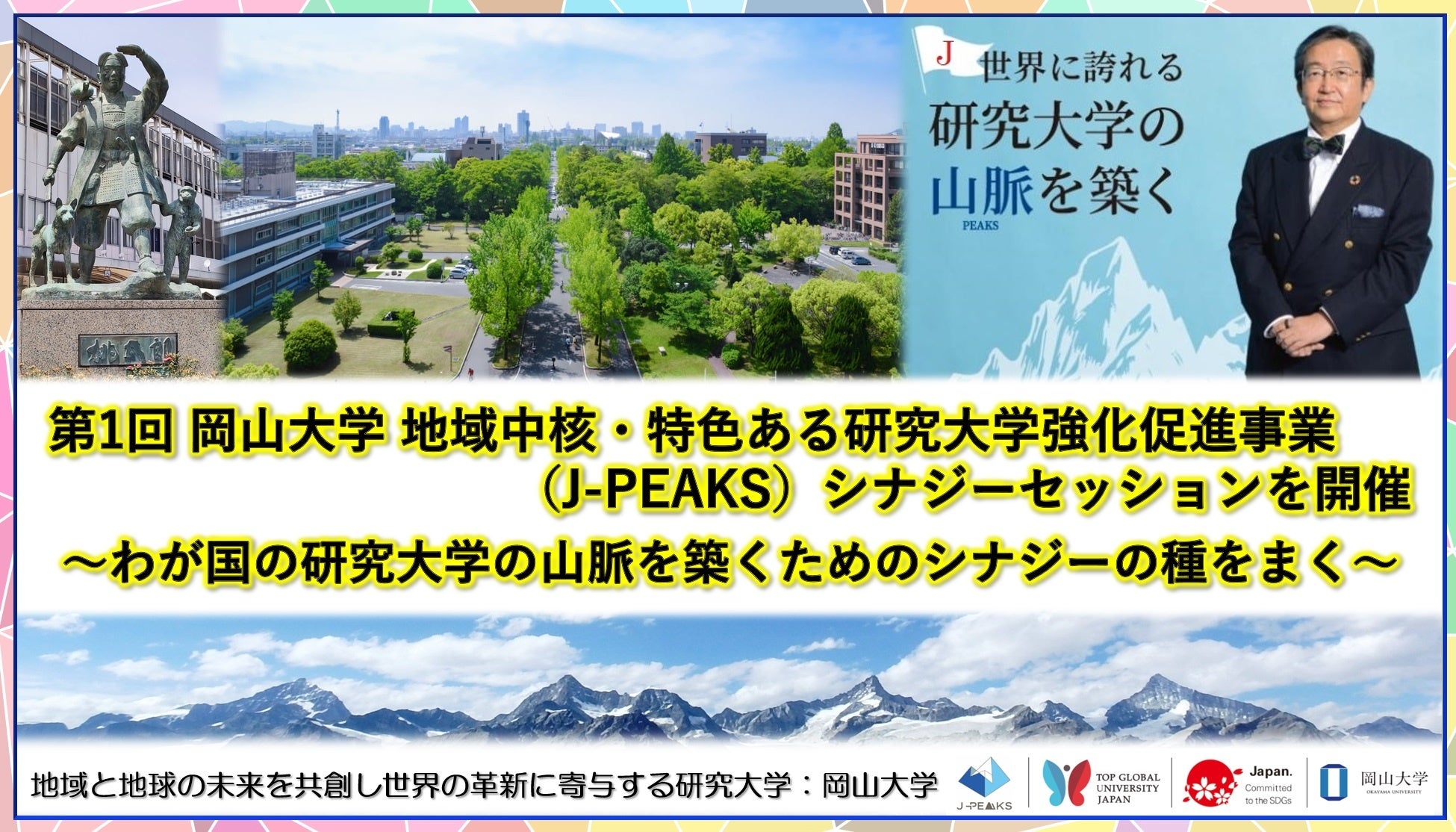 国立大学法人岡山大学(本部:岡山市北区、学長:那須保友)は、昨年度、わが国全体の研究力の発展を牽引する研究大学群の形成を目的とする文部科学省「地域中核・特色ある研究大学強化促進事業(J-PEAKS)」(実施主体:日本学術振興会)に採択されました。本学では岡山大学長期ビジョン2050「地域と地球の未来を共創し、世界の革新に寄与する研究大学」の実現に向けた「ひとつの手段」「目的(ビジョンの実現)を達成するための加速要因」などとしてJ-PEAKSの理念に共感し、活用しています。