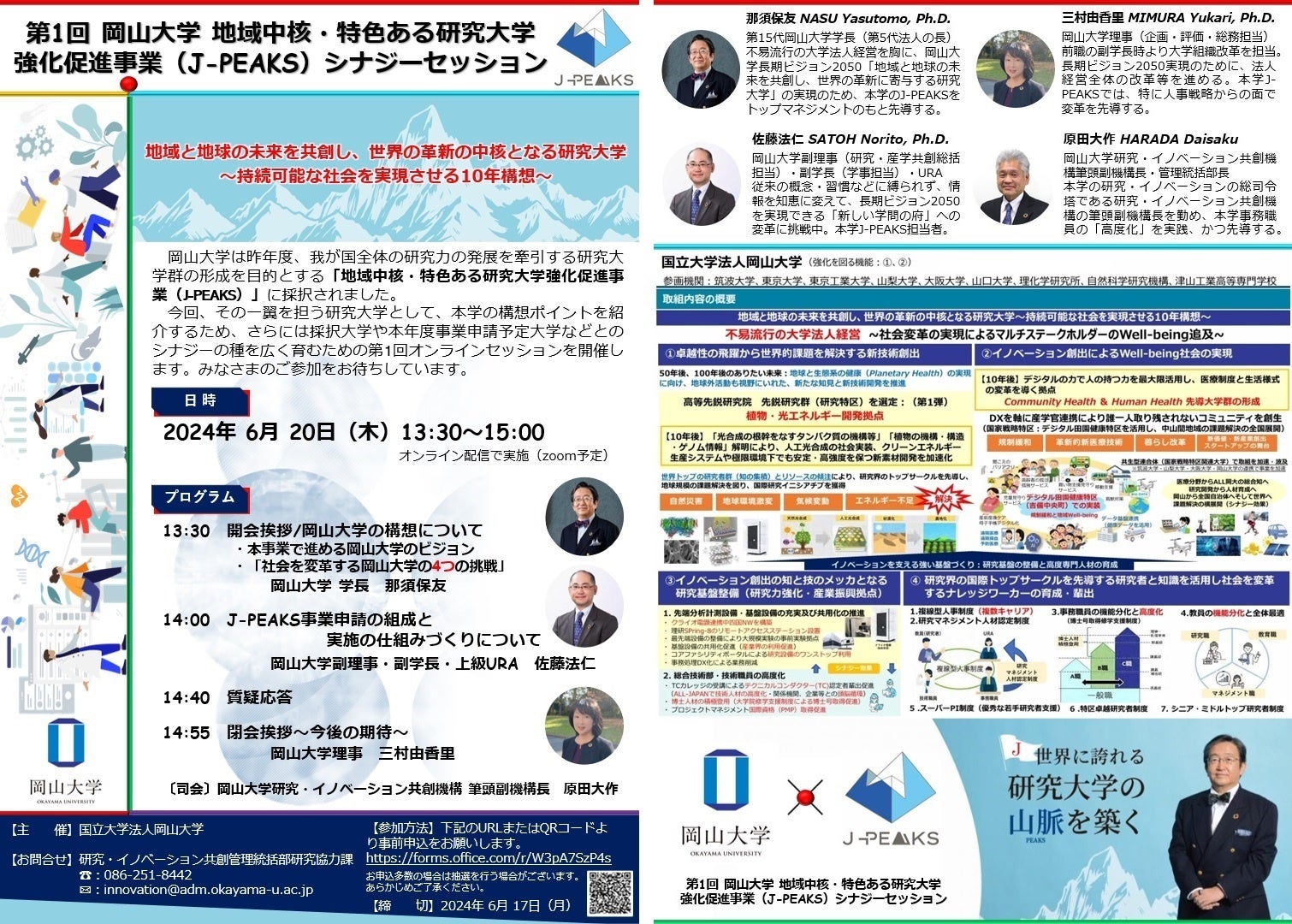 2024年6月20日、本学の構想のポイントや目指すべき点、さらにはJ-PEAKS採択大学や本年度事業申請予定大学などとシナジーの種を広く育むことなどを目的として「第1回 岡山大学 地域中核・特色ある研究大学強化促進事業(J-PEAKS)シナジーセッション」をオンラインで開催しました。