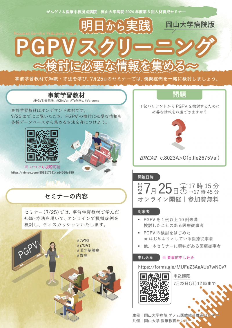 今回、がんゲノム医療に携わる看護師やがん看護に携わる看護師(がんゲノム医療連携病院等の医療機関に所属していること)を対象に「PGPVスクリーニング~検討に必要な情報を集める~」を2024年7月25日(木)17:15~17:45にオンラインで開催します。