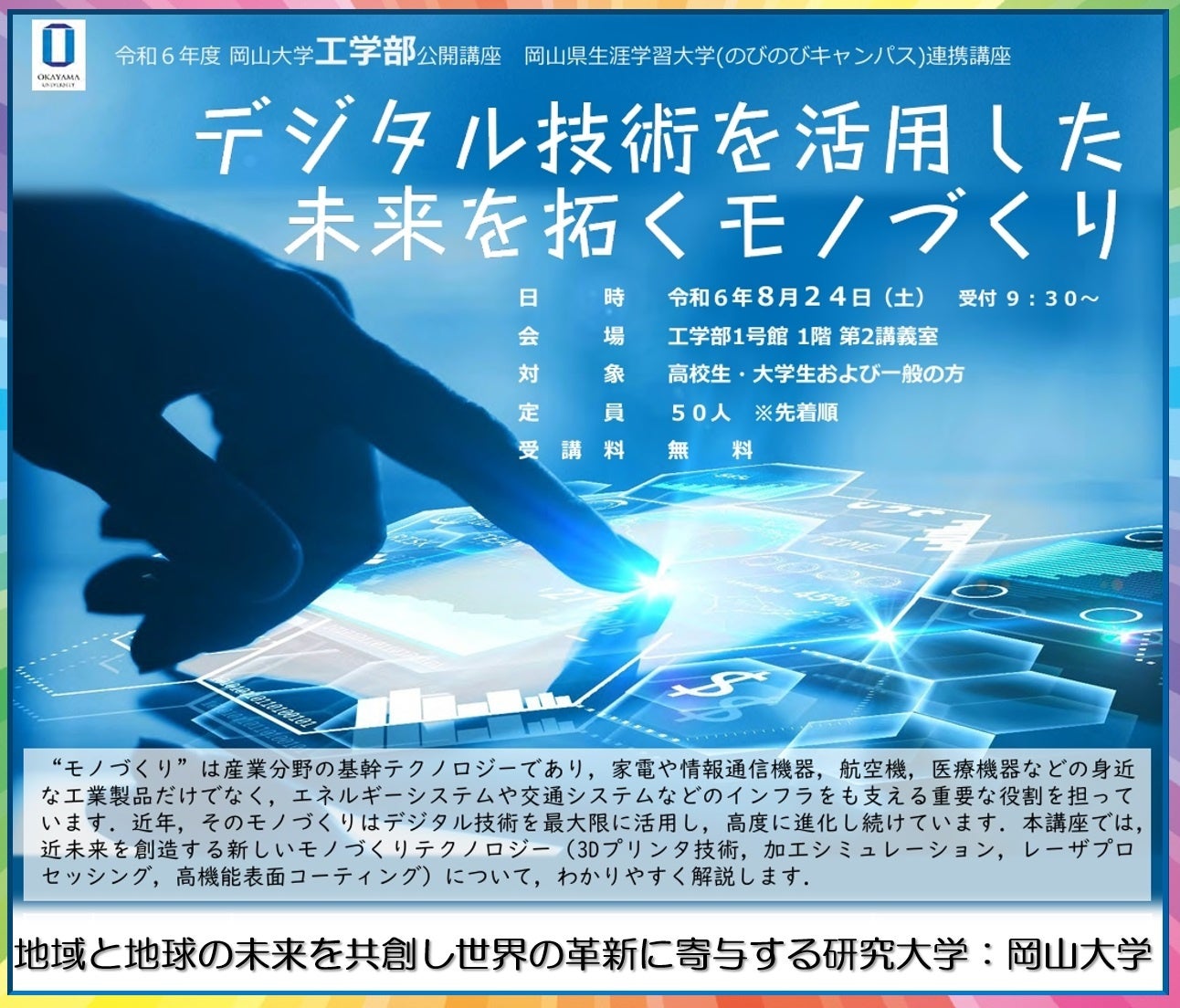国立大学法人岡山大学(本部:岡山市北区、学長:那須保友)では、本学津島キャンパスにおいて公開講座「デジタル技術を活用した未来を拓くモノづくり」を2024年8月24日(土)に開催します。